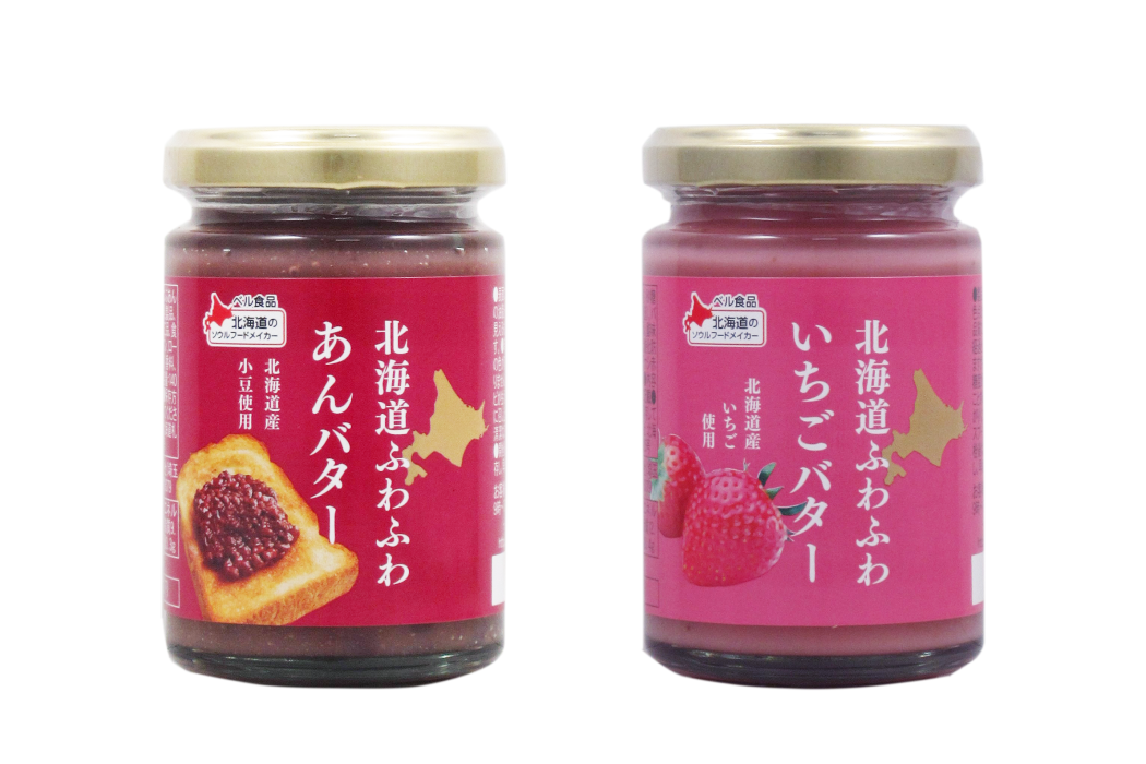 北海道産のバターをたっぷり使用し、ふわふわでなめらかな食感の北海道ふわふわバタースプレッドシリーズに「北海道ふわふわあんバター」と「北海道ふわふわいちごバター」が仲間に加わりました。昨年8月に発売したハスカップ、りんご、そして今年2月に発売したレーズン、メロンに続くシリーズ第3弾となります。