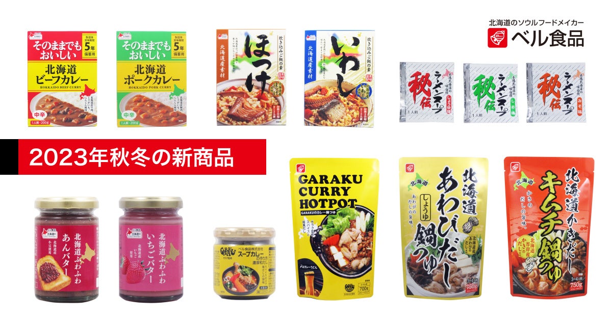 「成吉思汗たれ」「ラーメンスープ華味」「スープカレーの作り方」「ザンギ名人」など、北海道のソウルフードをご家庭で味わうためのたれ、つゆなどを製造販売する「北海道のソウルフードメイカー」ベル食品株式会社(本社:北海道札幌市西区、代表取締役社長:福山浩司、以下ベル食品)は、2023年8月4日(金)より2023年秋冬の新商品を販売開始いたします。