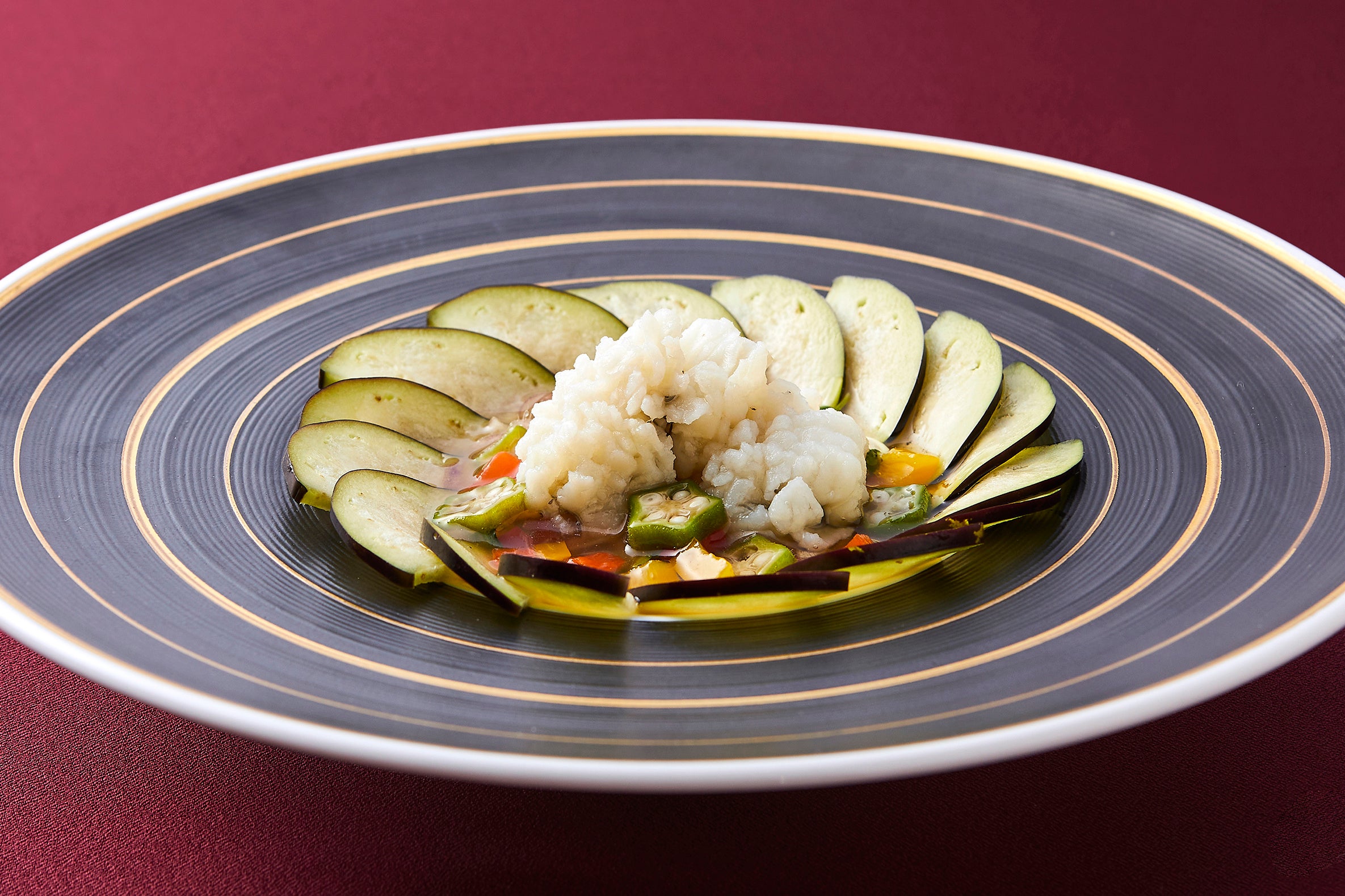 大阪南部の泉州地域特産の水なすをたっぷりお楽しみ頂ける前菜です。水なすは瑞々しく皮も薄い為、生でも美味しくお召し上がりいただけます。