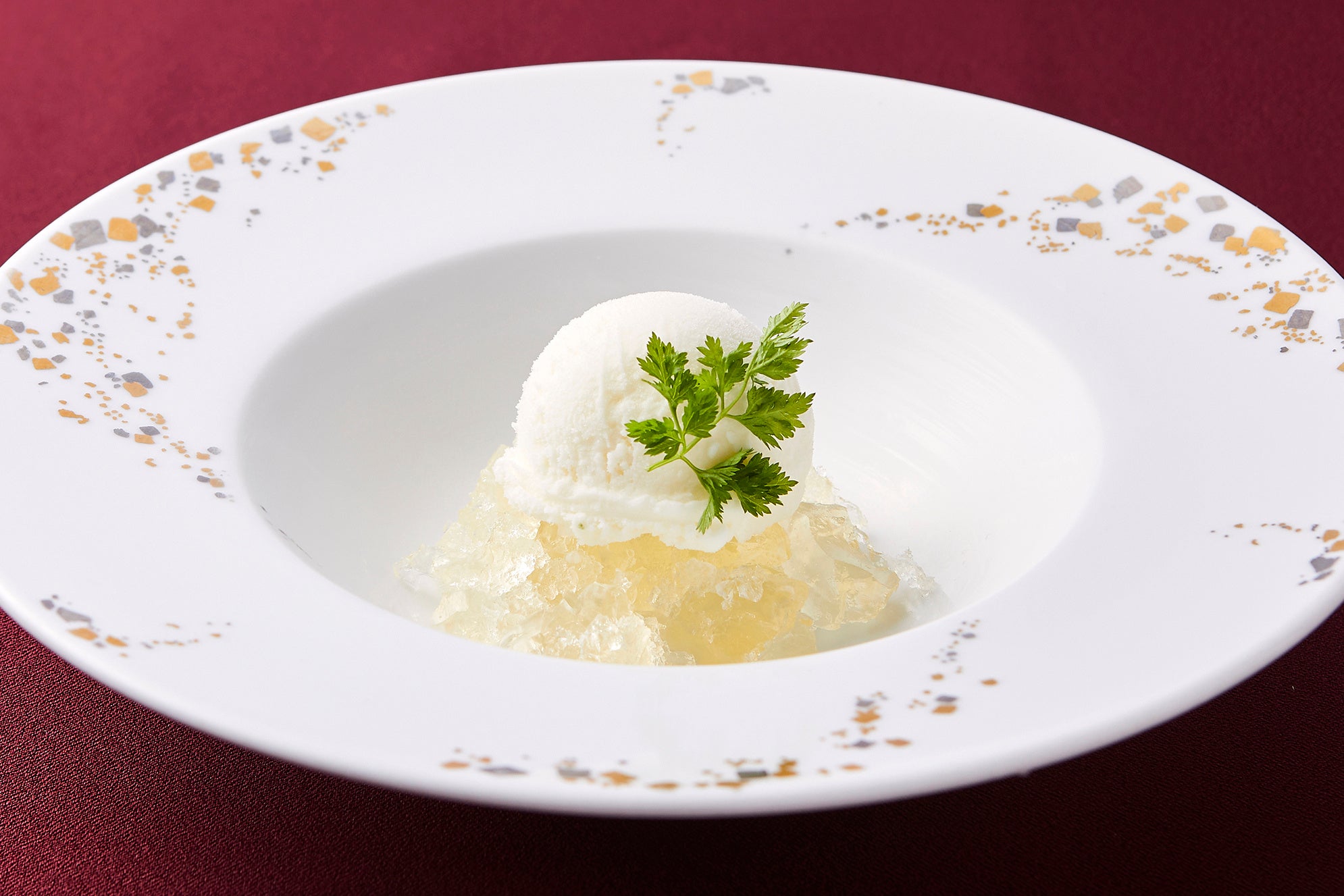 搾りたての生乳を加熱せず低温殺菌して使用した珠洲塩のジェラートは、コクがあるのに後味スッキリ。夏らしいさっぱりとしたレモンゼリーとご一緒にお召し上がりください。