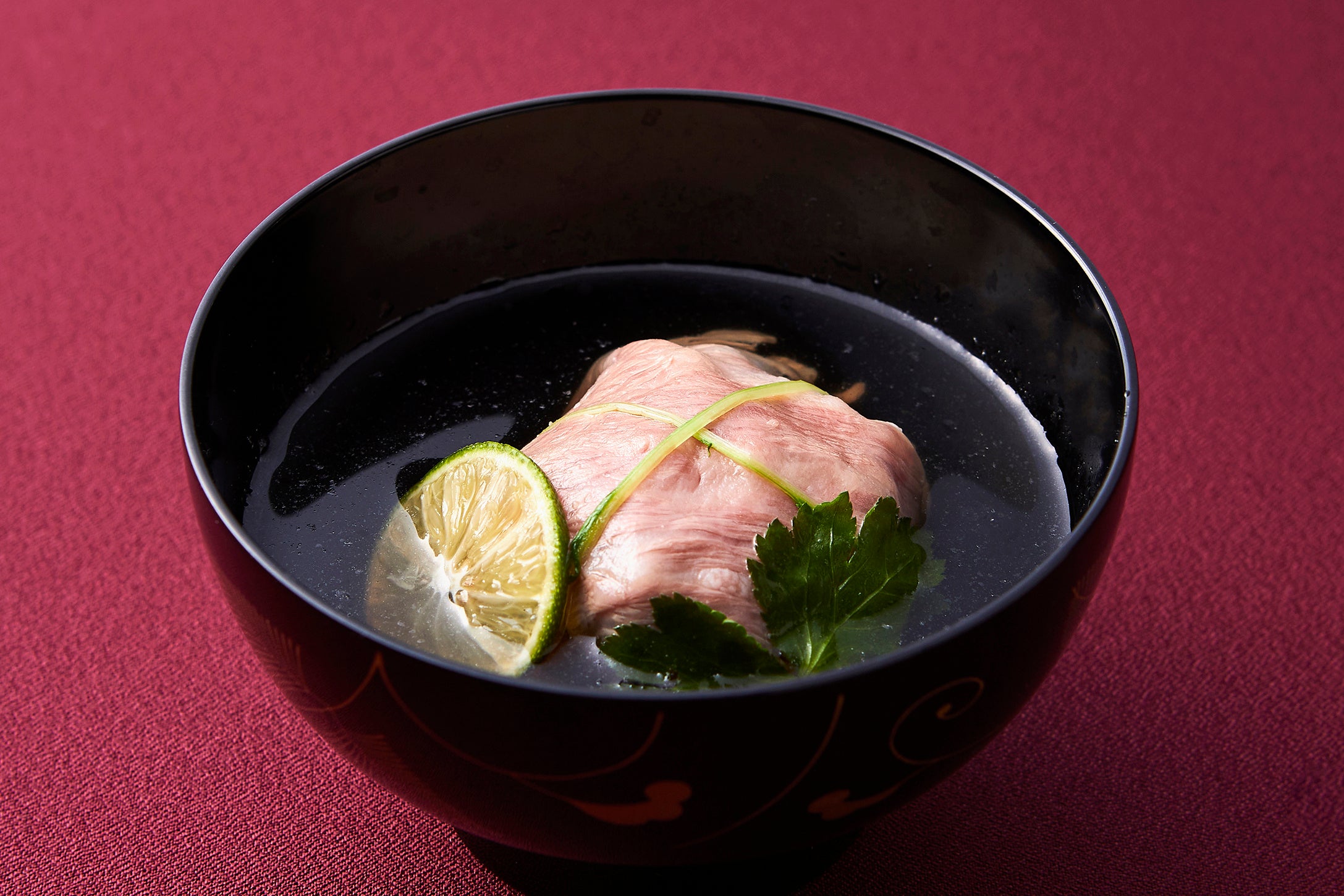 「肉うどんのうどん抜き」が発祥と言われる大阪名物の肉吸いを美食米門流にアレンジ。近江牛に包まれた雲丹をお出汁と一緒にお楽しみいただきます。