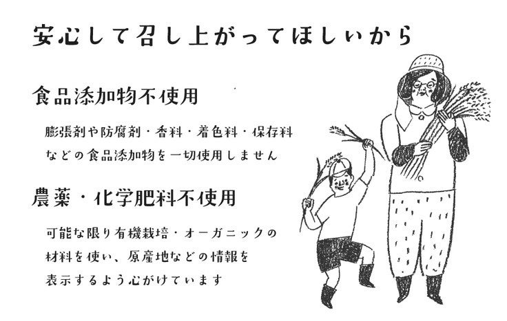 【身体への優しさにこだわり、無添加・無農薬の素材で製造】