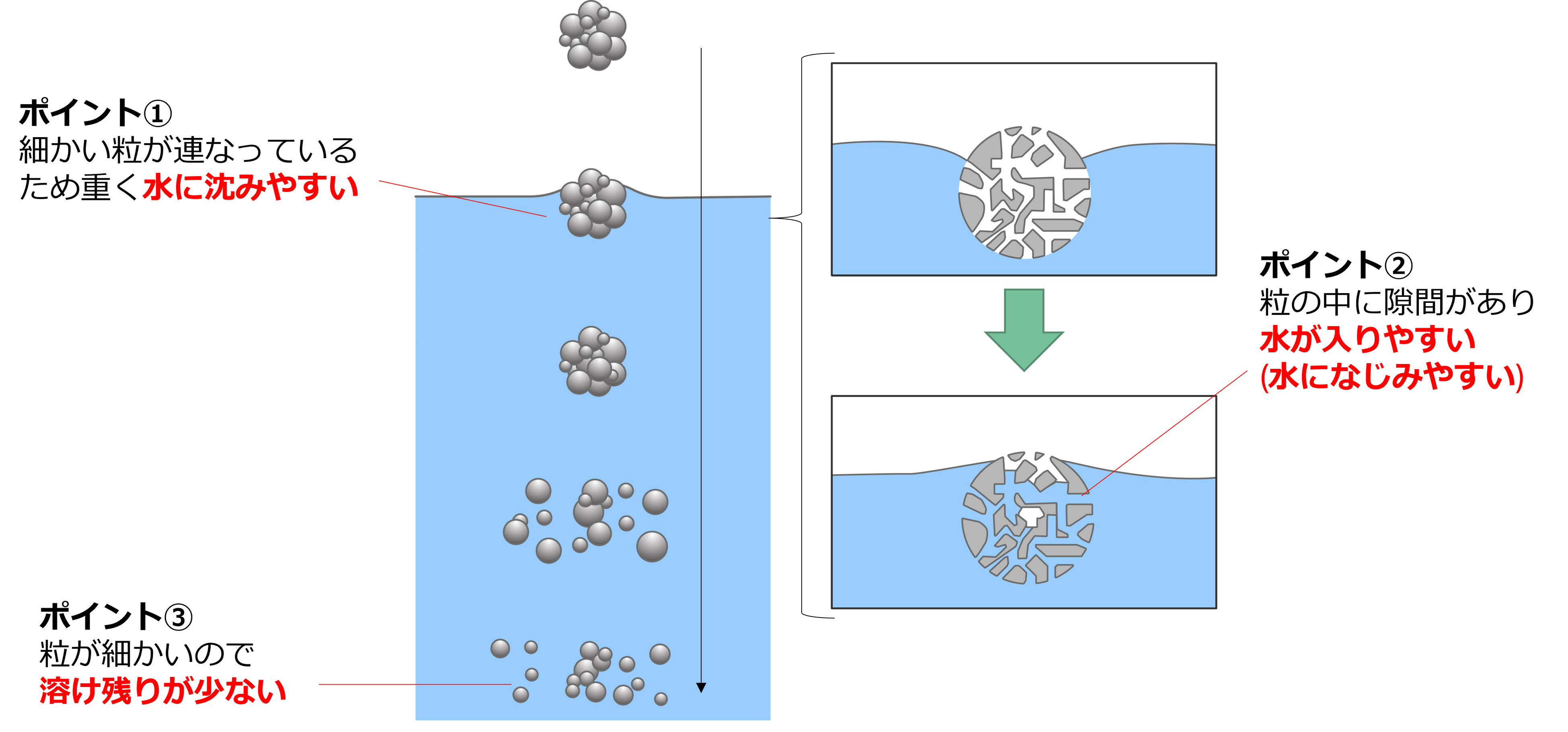 ② 粒の中に隙間があり水が入りやすい(水になじみやすい)