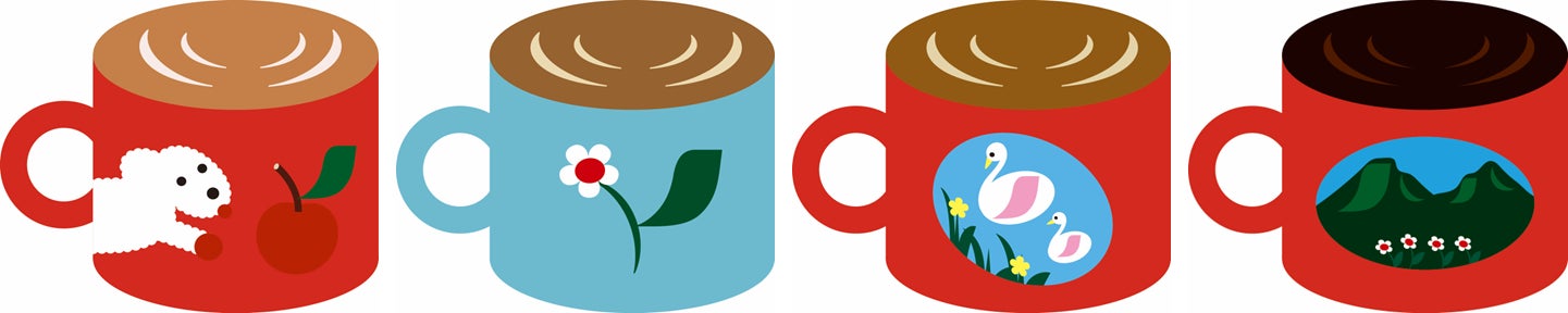 ・各ギフトセットにあわせて個性豊かなコーヒーマグを描いた、明るく楽しいインパクトのあるデザイン