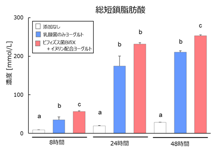 「In vitro腸内細菌叢培養モデル」に、乳酸菌のみのヨーグルト、あるいはビフィズス菌BifiXと食物繊維イヌリンを配合したヨーグルトを添加し、48時間培養しました。ビフィズス菌BifiXと食物繊維イヌリンを配合したヨーグルトを添加した場合、乳酸菌だけが含まれているヨーグルトに比べ、48時間後の総短鎖脂肪酸量が有意に多くなりました。