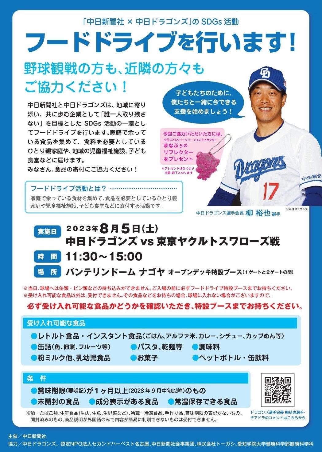 今回は中日ドラゴンズの選手もフードドライブに協力し、選手自身が自宅で余った食品を持ち寄って寄付します。