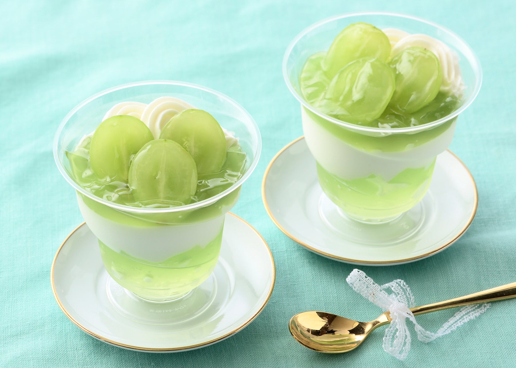 マスカットゼリー、レモン風味ゼリー、ヨーグルト風味ムースなどを層状に重ね、上面にシャインマスカットを飾った、見た目も爽やかなカップデザートです。