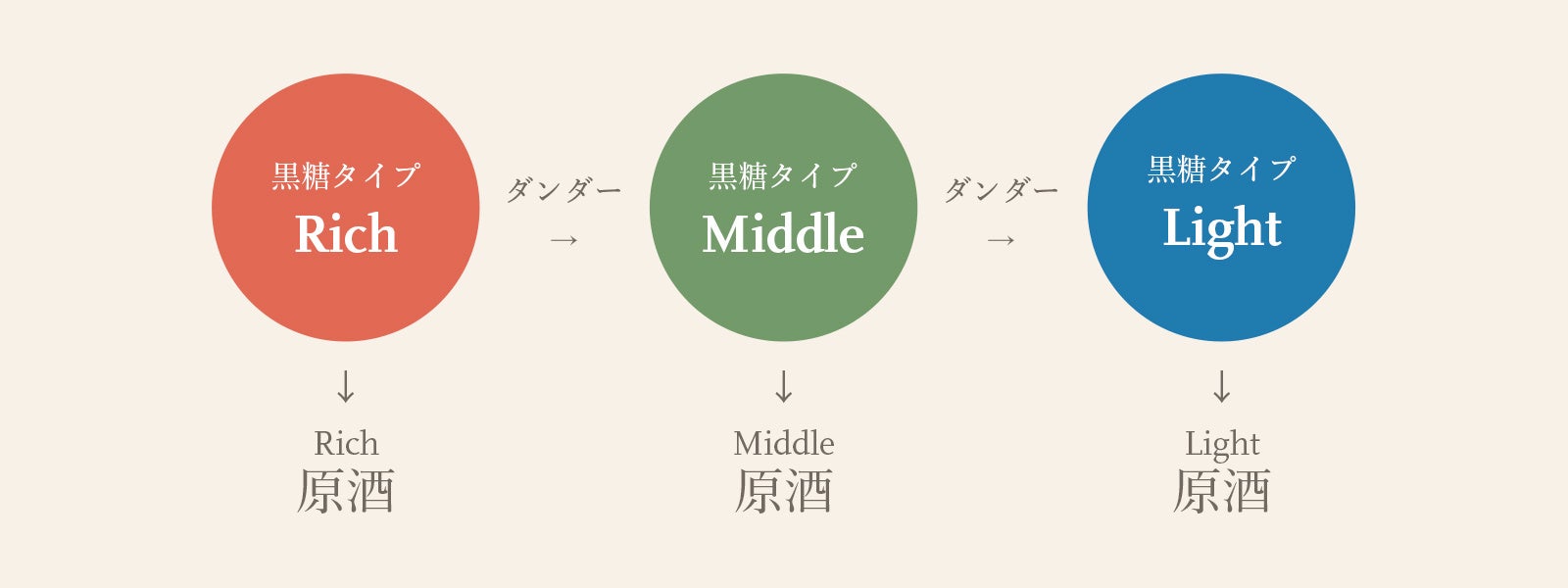 8島の黒糖テイスティングし、風味のタイプ別に「ライ ト、ミドル、リッチ」のカテゴリーに分類。3タイプの原酒を製造し、ブレンドして仕上げます。蒸溜後に通常は廃液として処分が必要なダンダー(Dunder)について、次の発酵工程に再利用するダンダー仕込み製法を、国内で初めて確立。黒糖の風味にダンダーが加わり、自社のさとうきび畑から分離に成功したONERUM酵母による発酵後、2回の蒸溜工程を経た原酒をブレンドすることで、豊かな風味が生まれました。