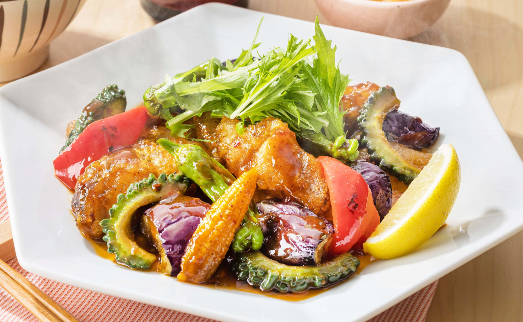 スケソウ鱈、ゴーヤ、ししとう、ヤングコーン、茄子、パプリカを、豆板醬、オイスターソース、山椒、五香粉などを配合した特製麻辣ダレで炒めた野菜炒め。ピリ辛コク旨で今までにない味付けに仕上げた一皿です。たくさんの夏野菜の食感と味を、レモンを絞って夏らしくさっぱりとお楽しみください。