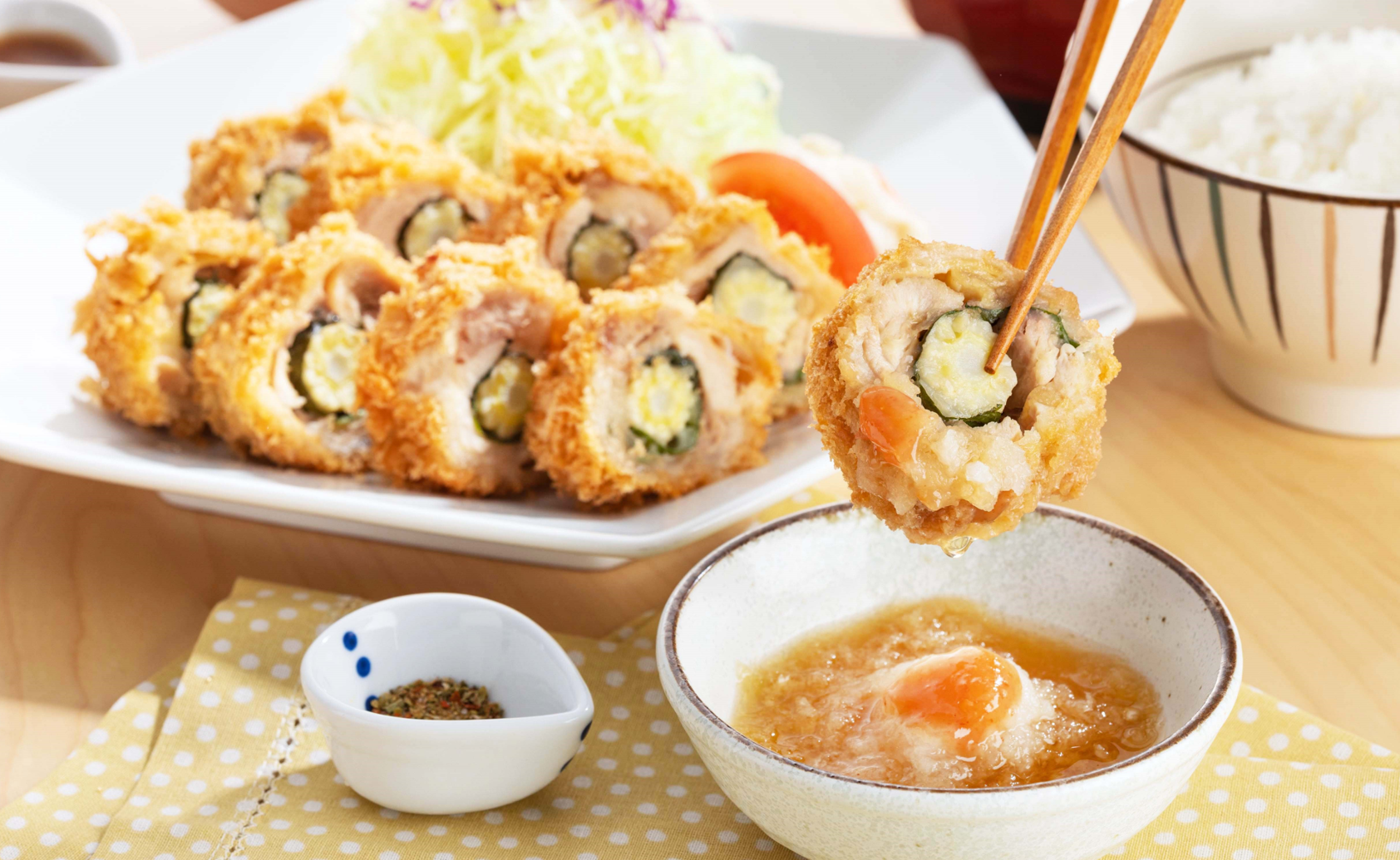 夏野菜のヤングコーンを大葉と鶏肉で巻き、カラッと揚げた“今夏イチオシ”の自信作です。 鶏肉、ヤングコーン、大葉を組み合わせたチキンかつは、夏らしく爽やかな味わい。梅おろし入りの和風出汁つゆにつけて“さっぱりと”食べられます。 お好みでハーブミックスをつけてお召し上がりください。