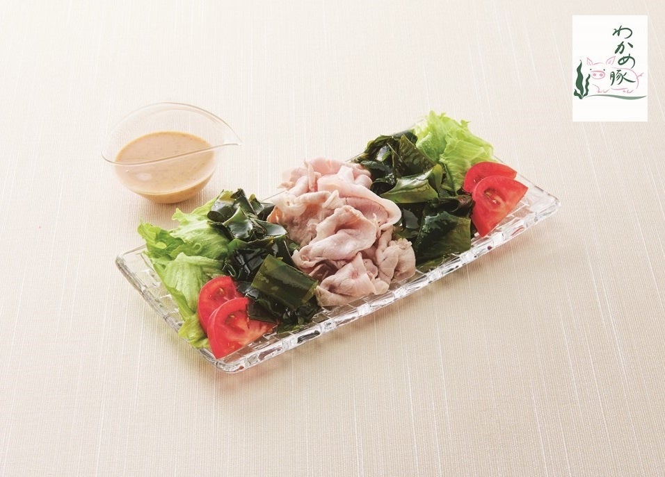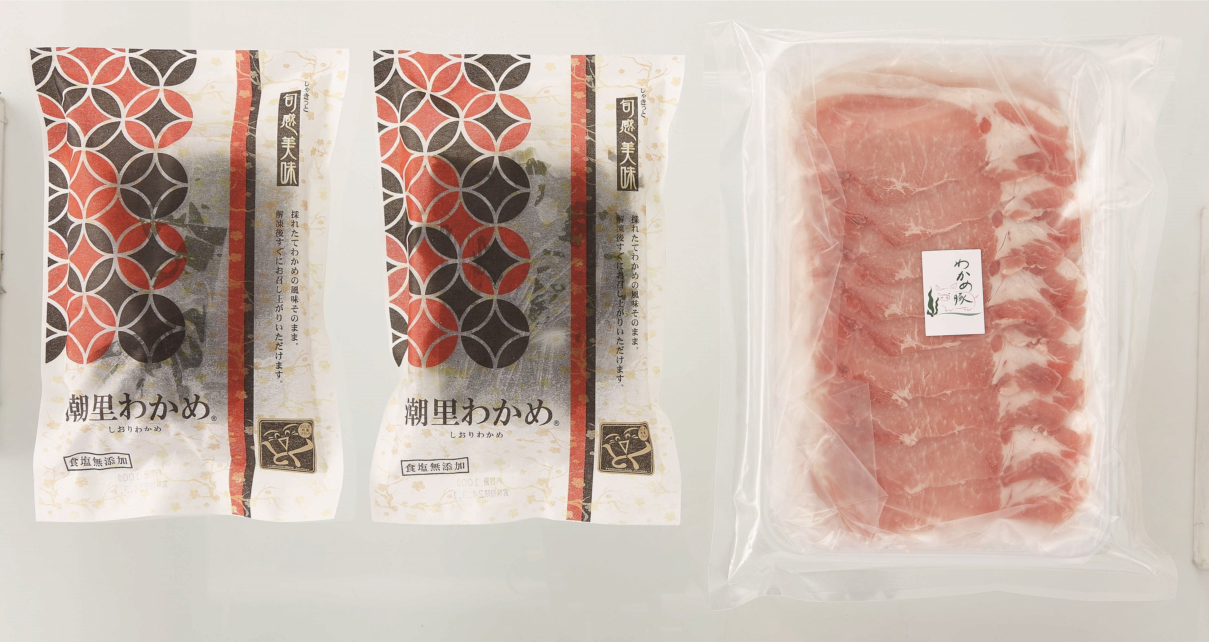 徳島県の名産品「鳴門わかめ」の収穫の際に生じる廃棄部分を飼料にし、徳島県のブランド豚「阿波美豚」に与えた「わかめ豚」と、収穫後すぐにボイル・凍結することで、鳴門わかめ本来の風味と食感の良さを楽しめる「潮里わかめ」を、一度に楽しめる冷しゃぶセットです。