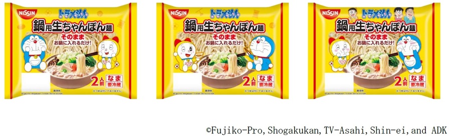 今年は、さまざまな種類がある市販の鍋つゆに合わせて、お好みの麺を選んでいただけるように、新たにちゃんぽん麺を発売します。つるみとコシにこだわった、もっちりとした食感の麺は、寄せ鍋やちゃんこ鍋などのまろやかなスープのお鍋と相性抜群です。パッケージは、さまざまな表情を見せる「ドラえもん」と仲間たちのオリジナルデザイン3種類をご用意しました。