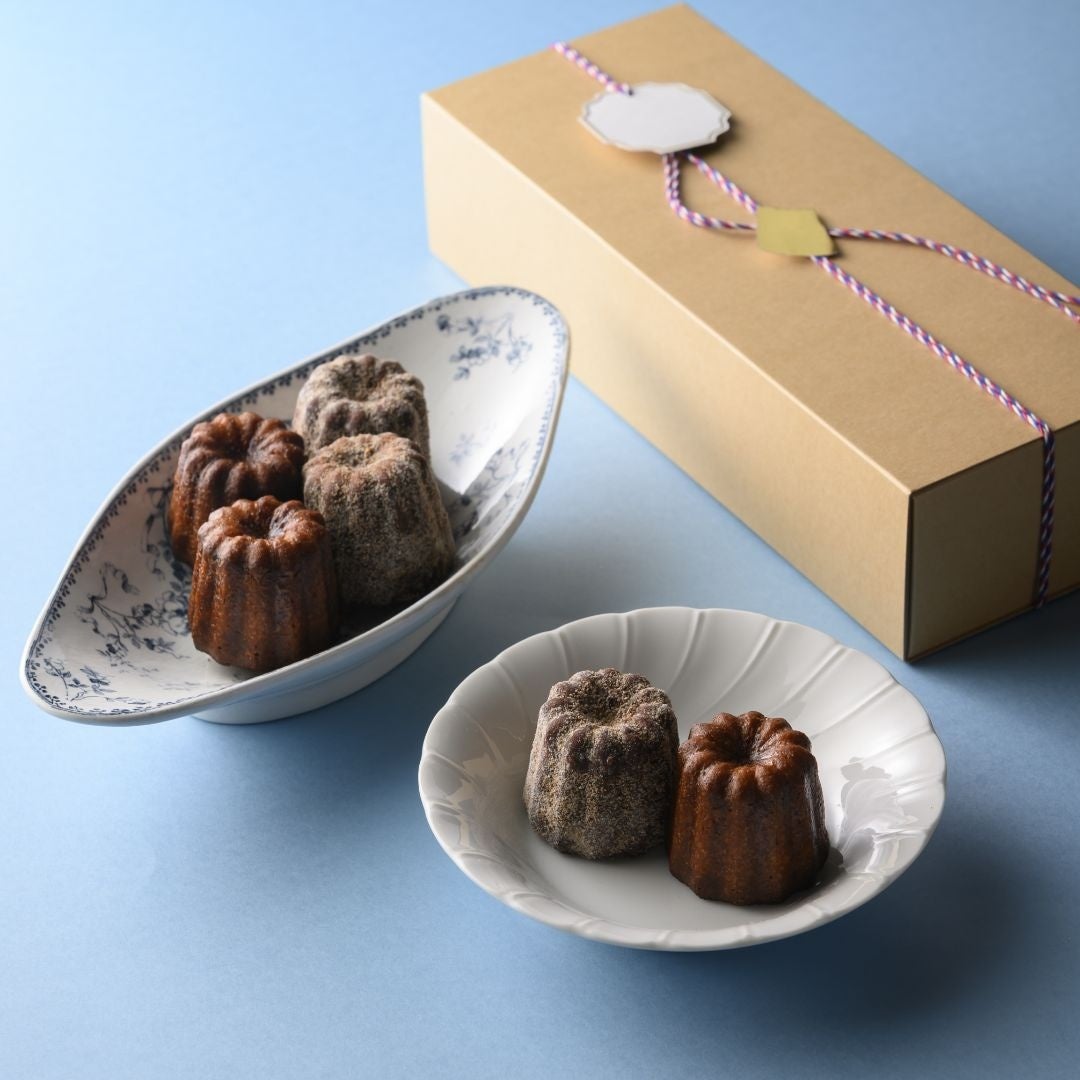 ナチュール(プレーン)、ベルジョワーズ(黒砂糖)の2種類のカヌレを詰め合わせました(1箱/12個入)。