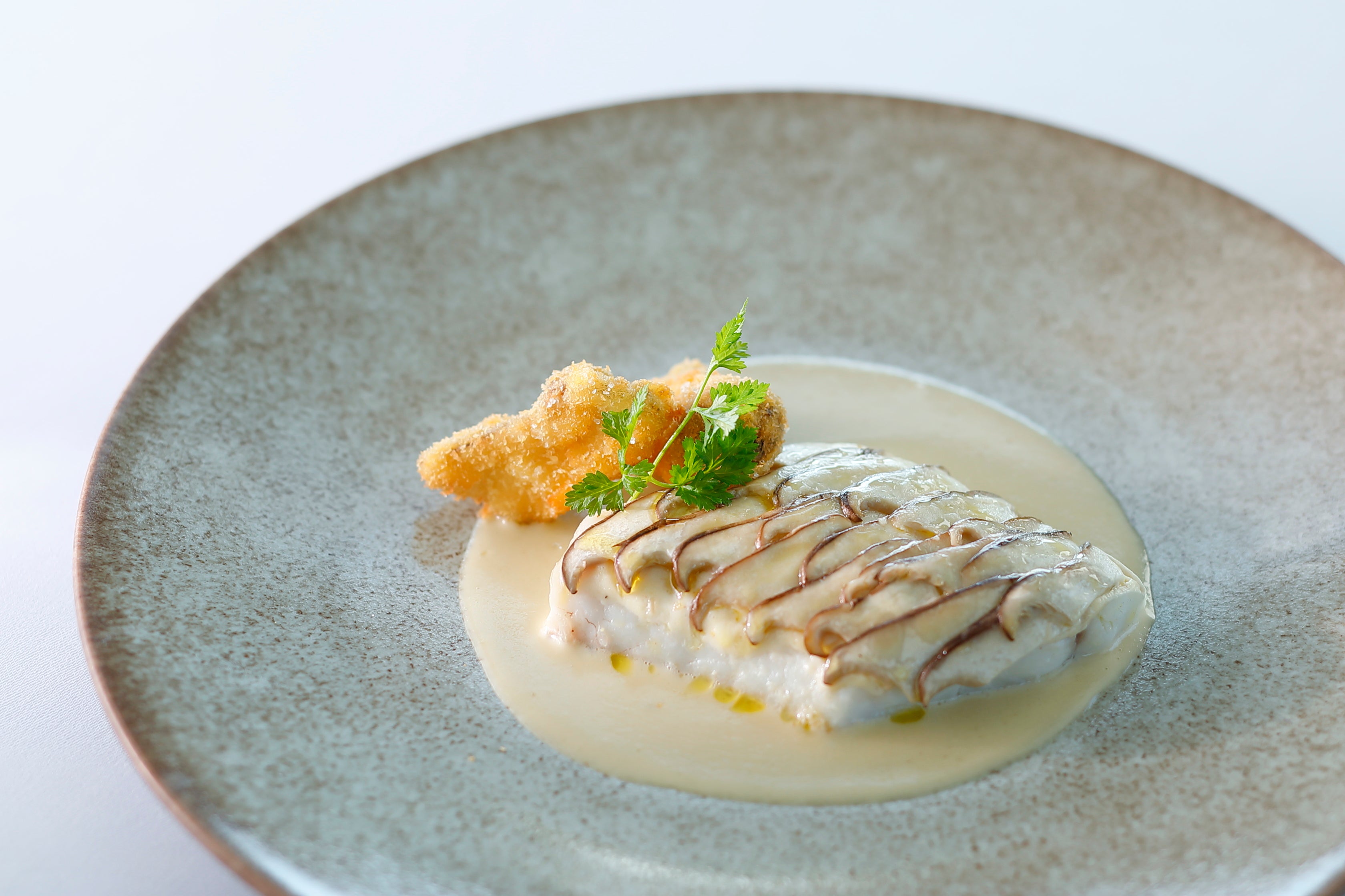 甘鯛に生の松茸のスライスを一枚一枚丁寧に並べ 香りが立つように蒸し焼きで仕上げました。バターのコクと白ワインの爽やかさ、エシャロットの独特な香りが調和するブールブランが甘鯛の美味しさと絡み合います。資生堂パーラーが得意とするフライを添えて食感も楽しめるひと皿になっています。