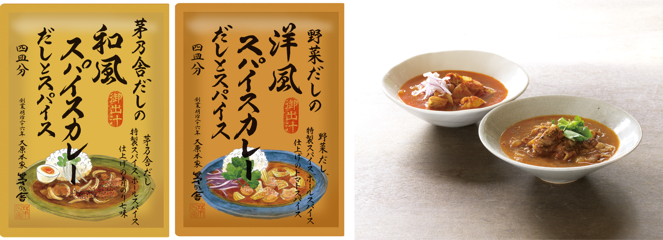 今回くばラボで開催される「カレーとうまみのヒミツ展」に先駆け、茅乃舎ではだしのうまみとスパイスの掛け合わせが新しい、「茅乃舎だしの和風スパイスカレー だしとスパイス」「野菜だしの洋風スパイスカレー だしとスパイス」を、8月2日より全国の茅乃舎店舗および通販サイトにて発売しております。