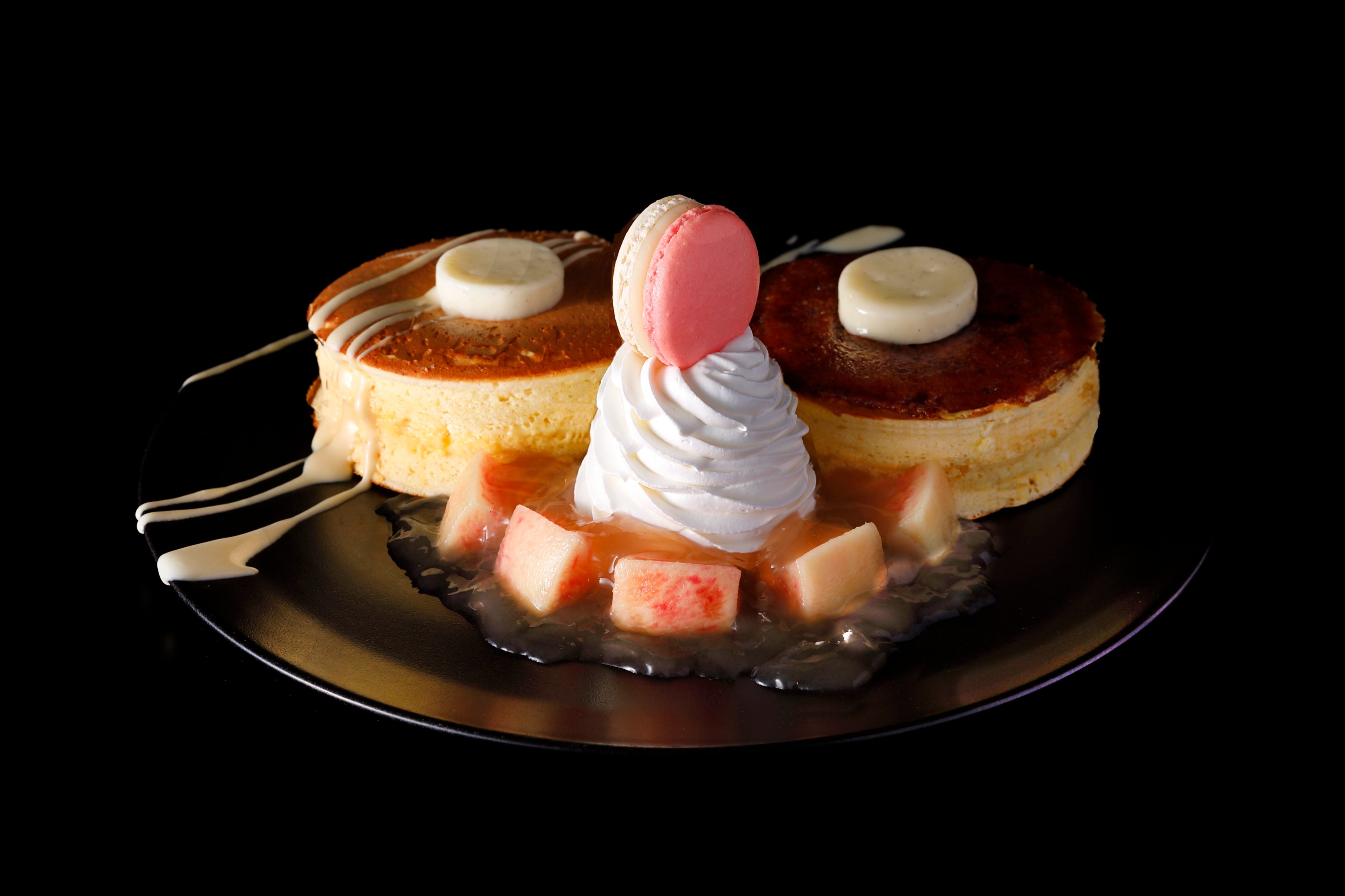 厚さ5cm”ふわっふわ”パンケーキが、マカロン・ジュレ・フレッシュ桃でピーチ一色にドレスアップ!