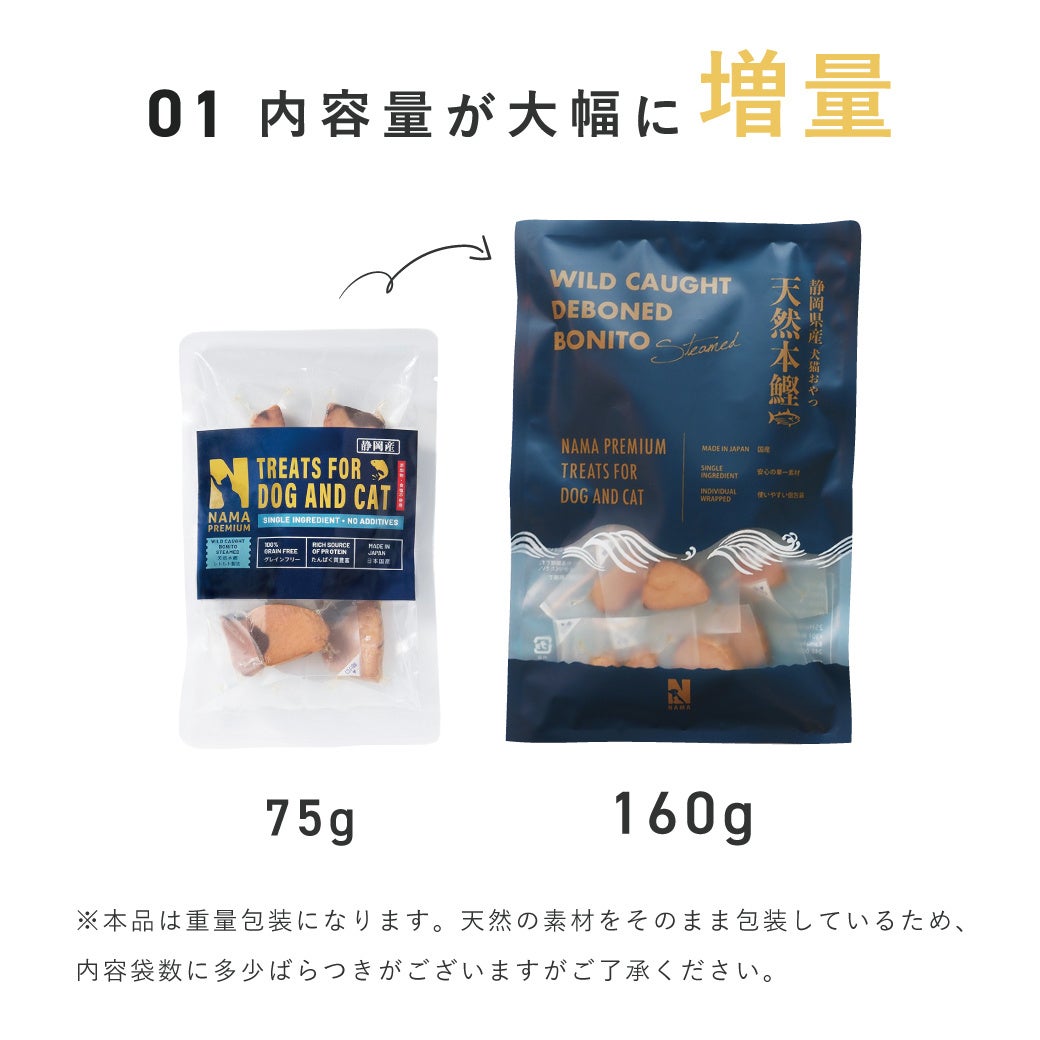 「1袋あたりの数が少ないから特別な日だけにしかあげられない。」というお客様の声に応え、内容量は従来の75gから160gへと大幅に増量。
