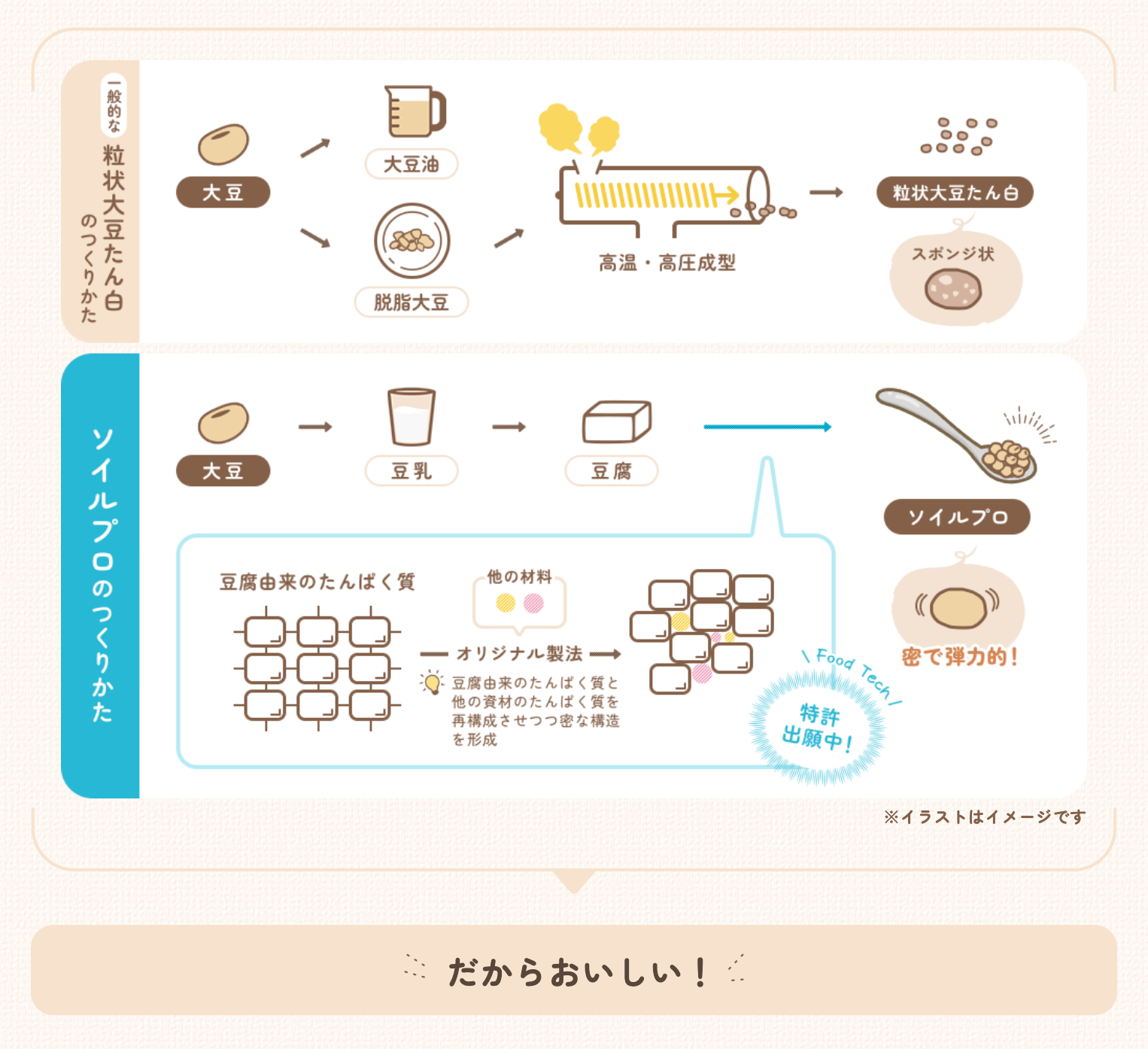 日本で昔から親しまれてきた「豆腐」に着目し、これまでの大豆ミートとは違う製法で作られるため、「大豆くささ」を抑えてクセのない風味を表現しています。