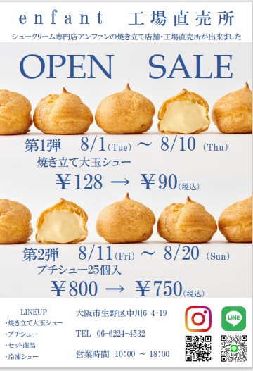 工場直売店所では、エキナカ百貨店でおなじみの「アンファンのプチシュー」をはじめ、焼き立てのシュー生地にアンファン自慢のカスタードクリームと生クリームを合わせた特製クリームをその場でたっぷりと詰め込んだ直売所限定の「焼き立てシュー」など、工場直売所ならではできたての商品やエキナカ、スーパーでおなじみの商品を手ごろな価格で地元の皆様様にお買い求めいただけます。