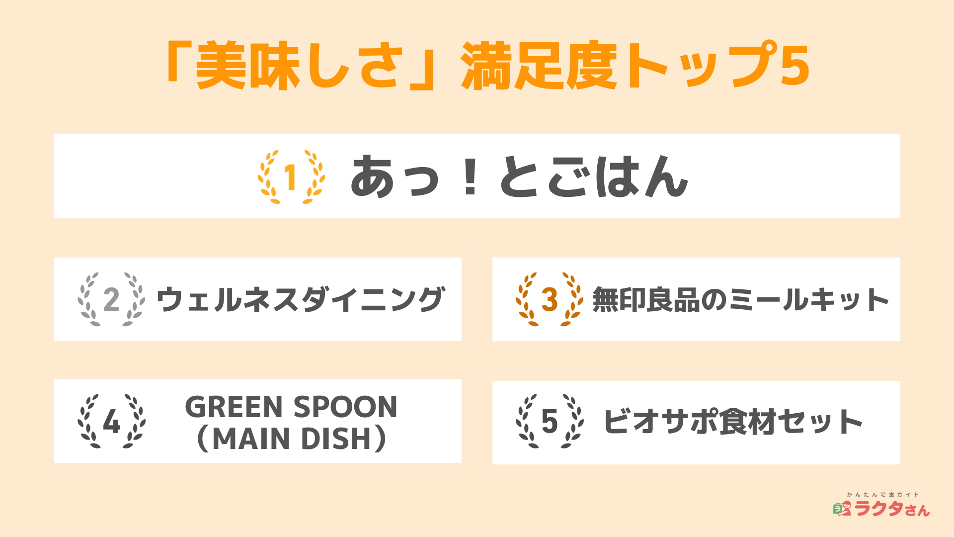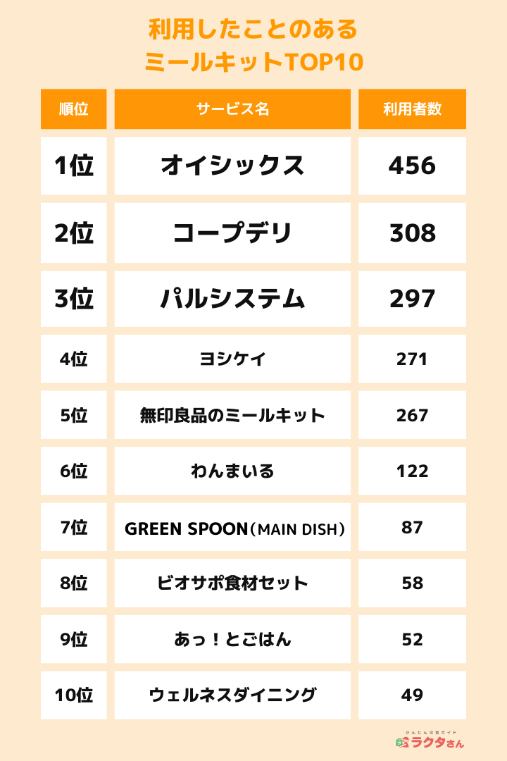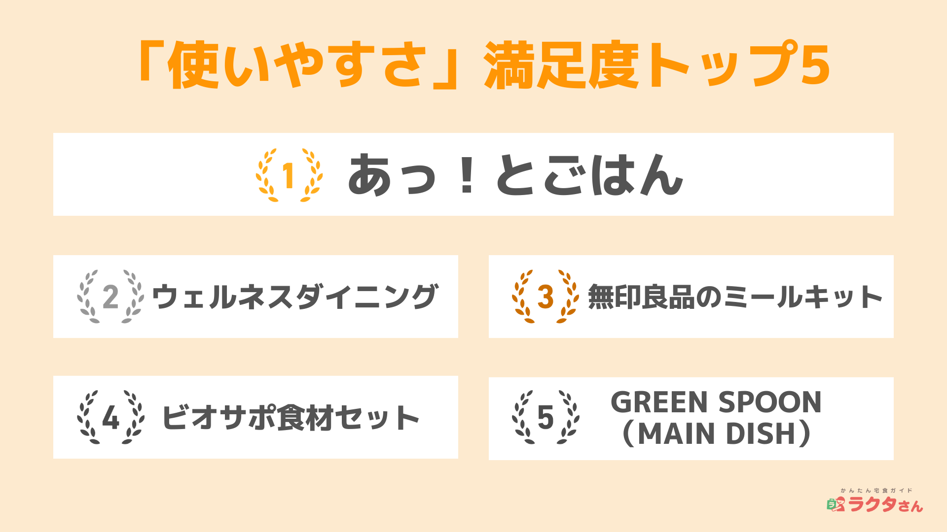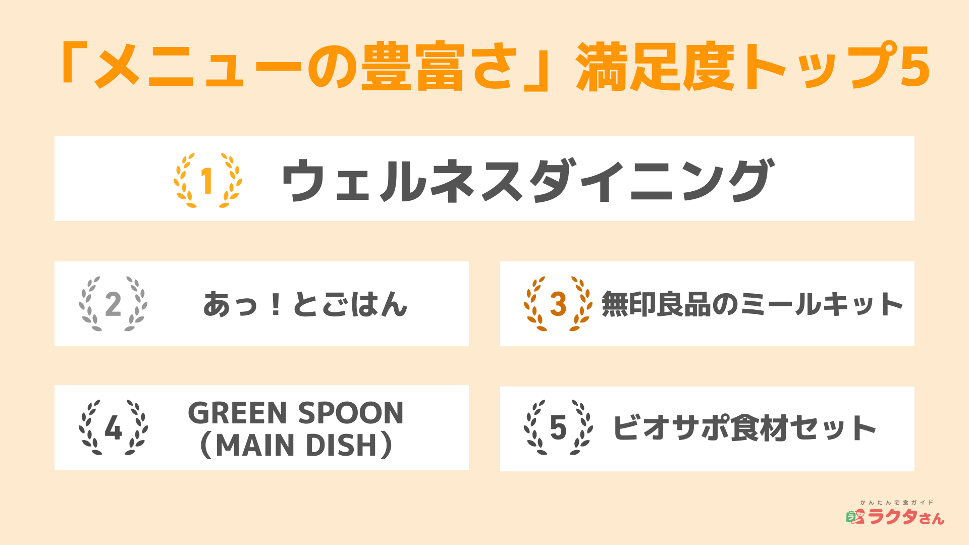 2位は「メニューの豊富さ」でトップだった「ウェルネスダイニング」。3位は「無印良品のミールキット」で、利用者数では全体5位に選ばれており、ブランド認知度の高さや、料金の安さから、利用しやすいと感じる人が多いのではないでしょうか。