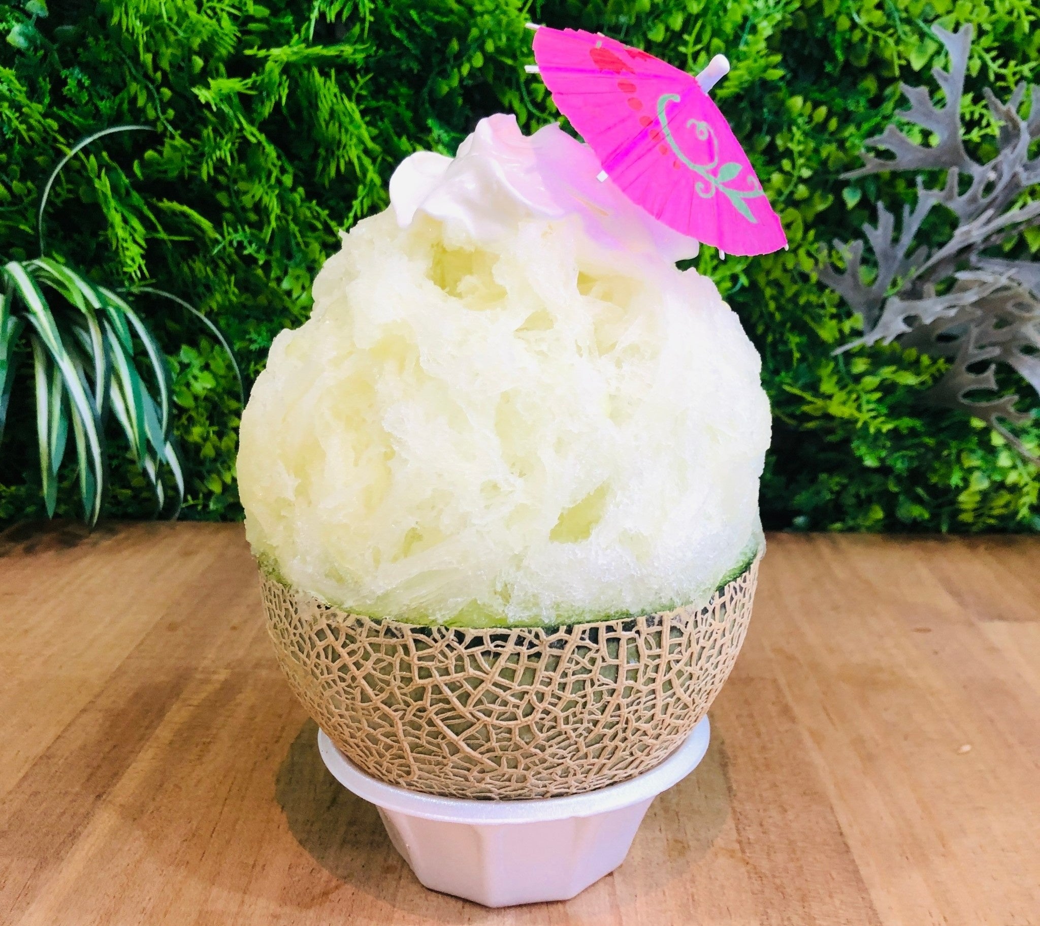 国産メロンを1/2個使った贅沢なひと品。氷の上に自家製メロンシロップとホイップクリームをトッピング。
