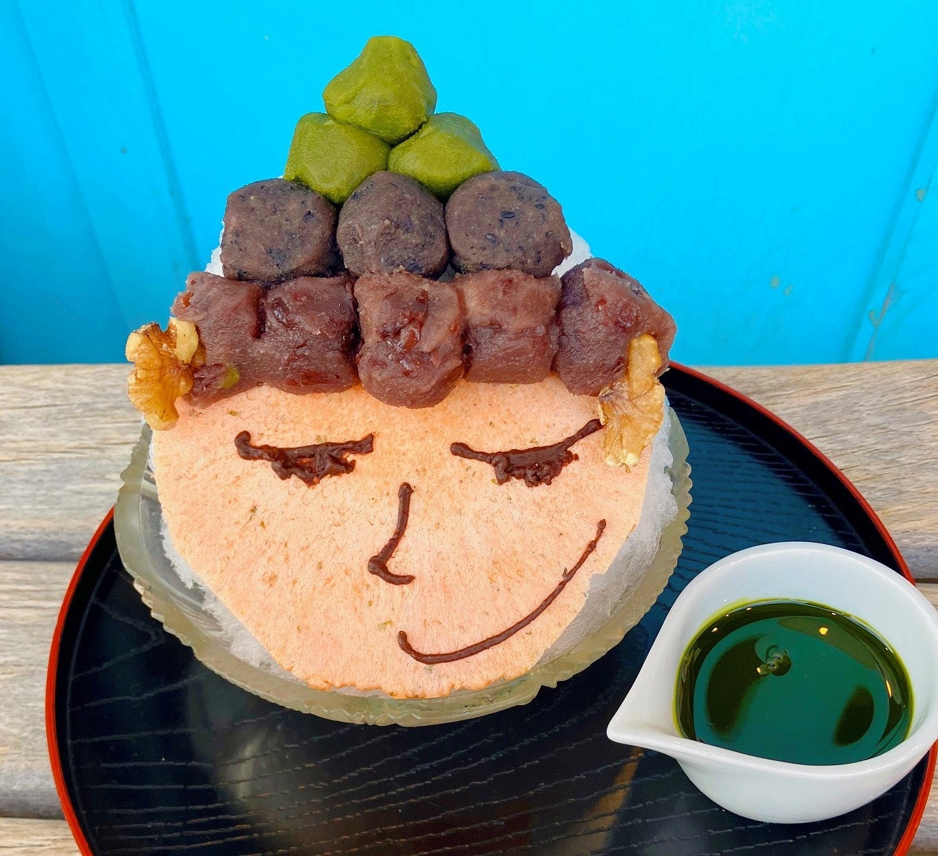 鎌倉名物“大仏さん”がかき氷に。螺髪(らほつ)に見立てたあんこ(あずき・黒ごま・お抹茶)を抹茶シロップでいただくひと品。