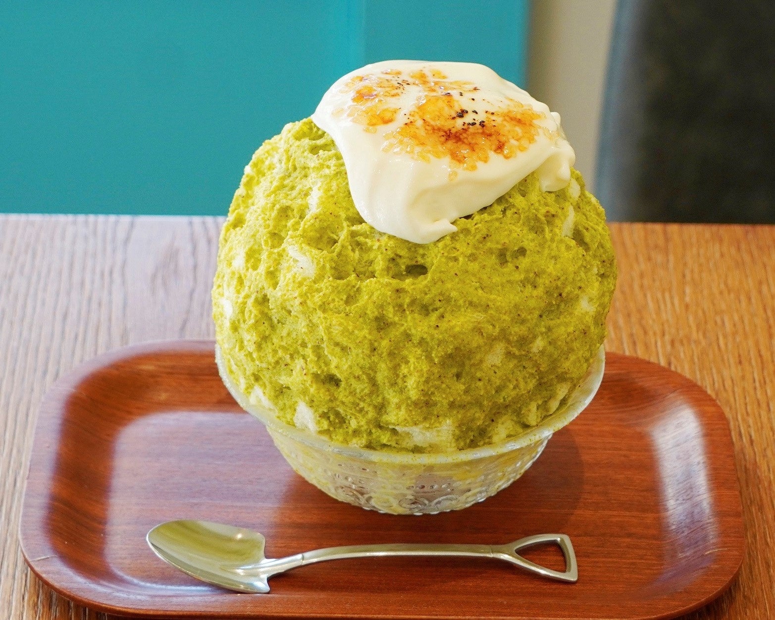 イラン産のスーパーグリーンピスタチオをブレンドし、色にも濃さにもこだわったかき氷。ラズベリーソースの酸味も良いアクセントに。