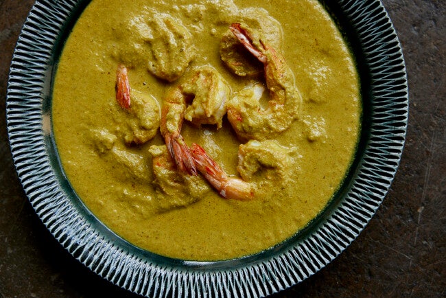 ナッツやヨーグルト、生クリームでつくる北インドの伝統料理「コルマ」を、爽やかなグリーンのカレーに仕上げました。掛け合わせたのは、美しい緑色に甘く繊細な風味のピスタチオ、爽快なフレッシュハーブのパクチーとミント。そこに、カレーづくりに欠かせないコリアンダーリーフなど3種のスパイスと、上品な香りのカルダモンなど、数種のスパイスをシンプルに合わせています。