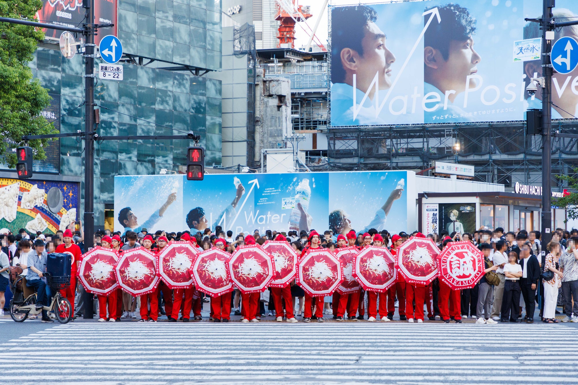 渋谷スクランブル交差点~センター街:人が集まる渋谷の街で、「蒙古タンメン中本傘」が強烈な存在感を放ちます。スマートフォンを構えて写真を撮る方や、「蒙古タンメンだ!」「北極だ!」など、通行人の目を惹きつけました。