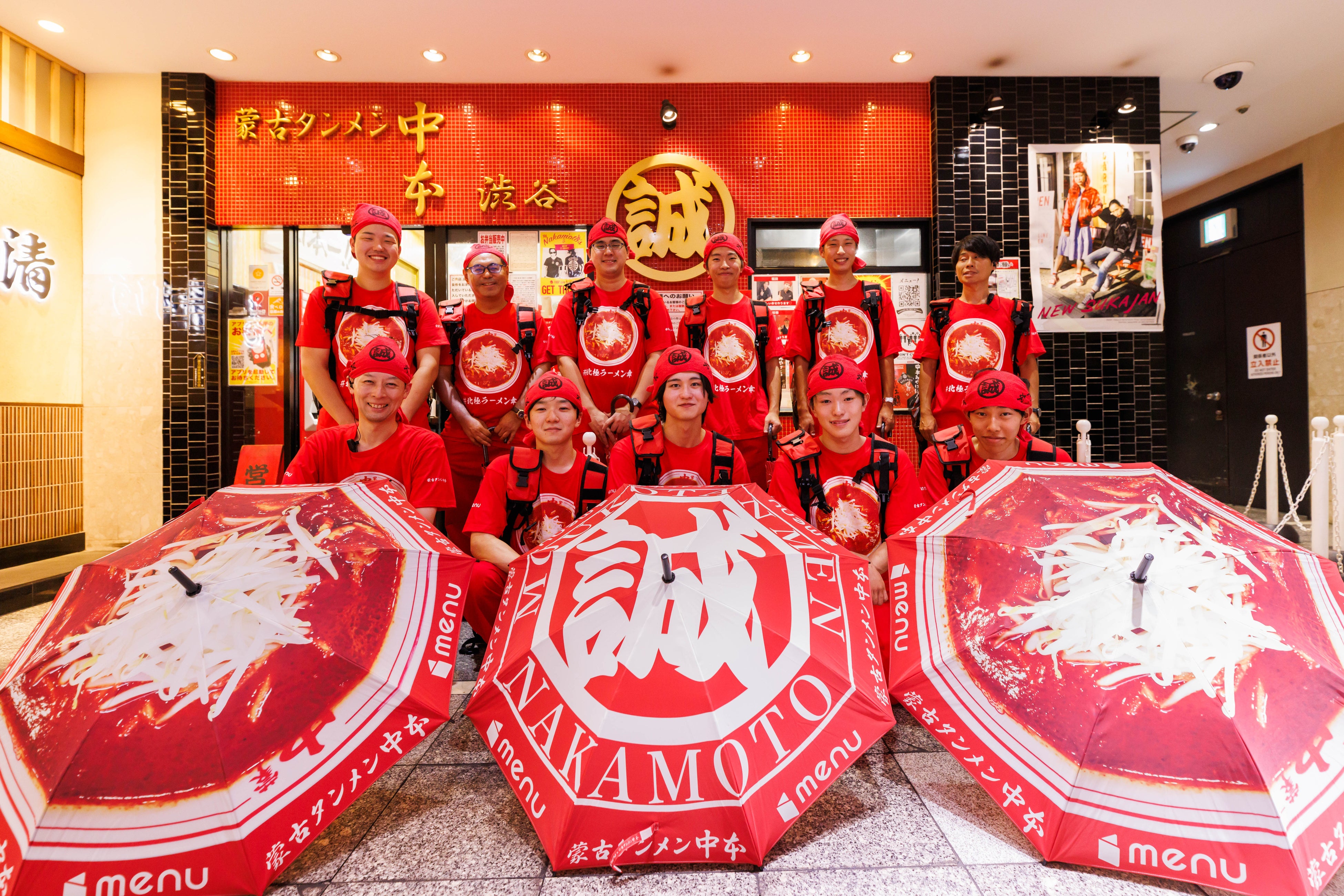 今回のゲリラプロモーションでは、menuのデリバリーバッグを背負い、「北極ラーメン」がプリントされた真っ赤なTシャツに身を包んで「蒙古タンメン中本傘」を差す“中本軍団”が渋谷の街に初登場。SNSでも話題になるなど、人があふれる渋谷で大きな注目を浴びました。中本軍団はスクランブル交差点、センター街、蒙古タンメン中本 渋谷店までを練り歩き、街ゆく人々に強烈なインパクトを残しました。