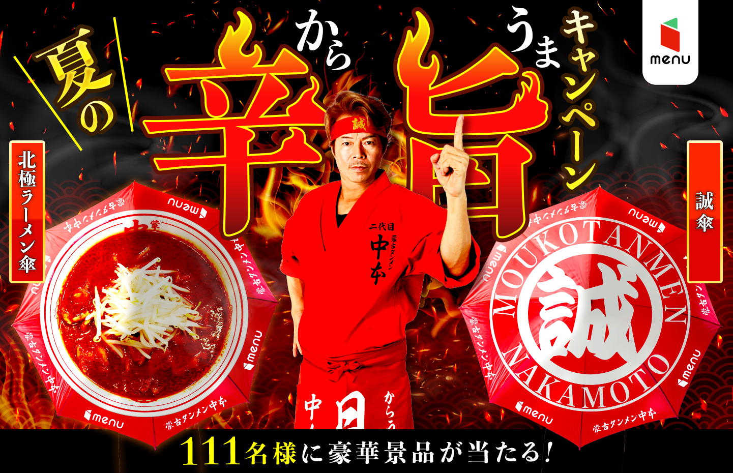 menuでは、2023年8月7日(月)から8月13日(日)の期間限定で、「蒙古タンメン中本傘」が抽選で当たる蒙古タンメン中本とのコラボ企画「夏の辛うまキャンペーン」の開催も予定しています。menuでは、今後も加盟店さまと連携し、お客さまにさらに素敵な食体験をお届けしてまいります。