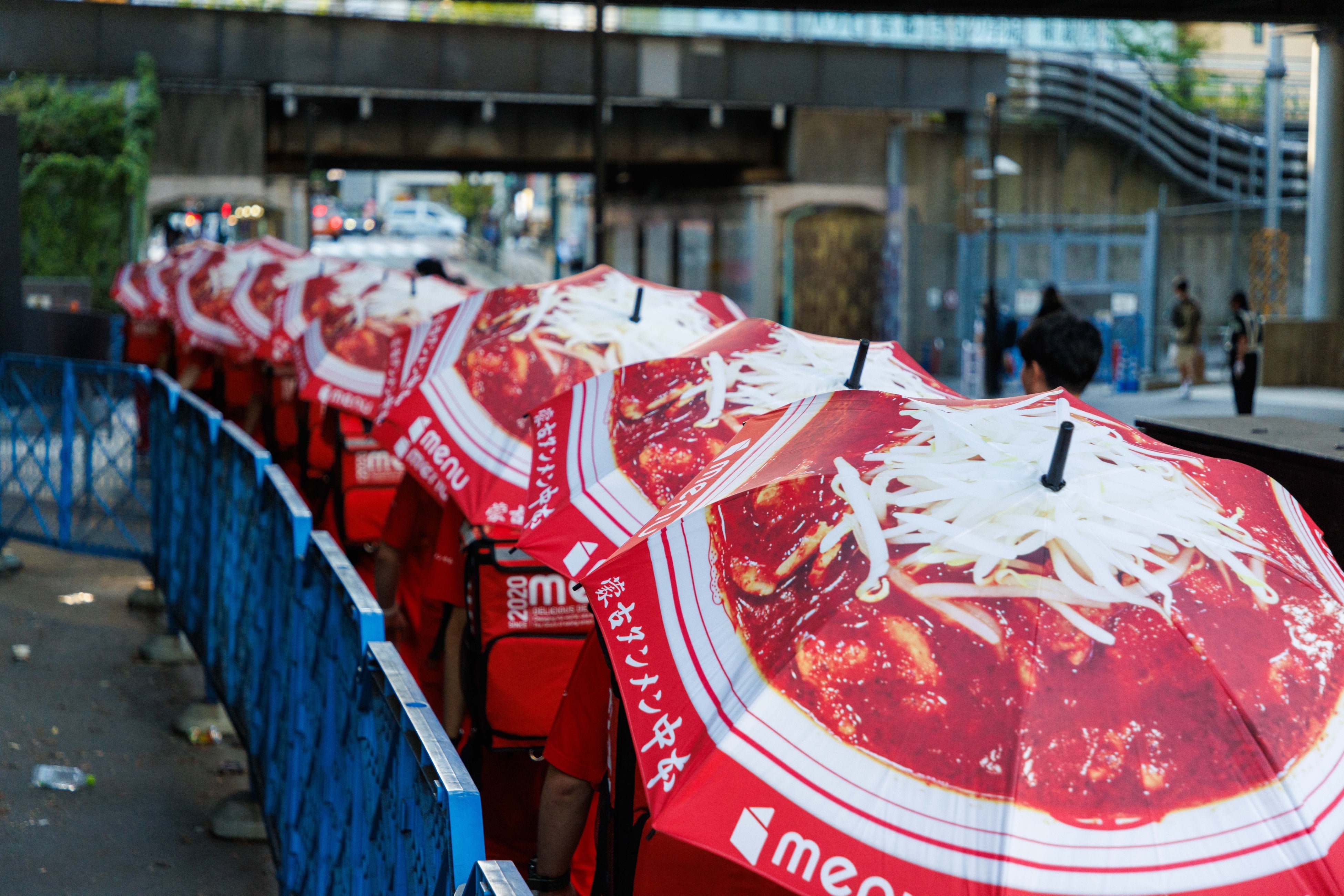 menuは2023年8月3日、「蒙古タンメン中本」のデリバリー提供開始を記念した“ゲリラプロモーション”を実施。真夏の渋谷を舞台に、menuと「蒙古タンメン中本」のコラボグッズ「蒙古タンメン中本傘」を差した23人の“中本軍団”が集結し、街を練り歩きながらチラシを配り、“辛うま”の魅力を熱くアピールしました。