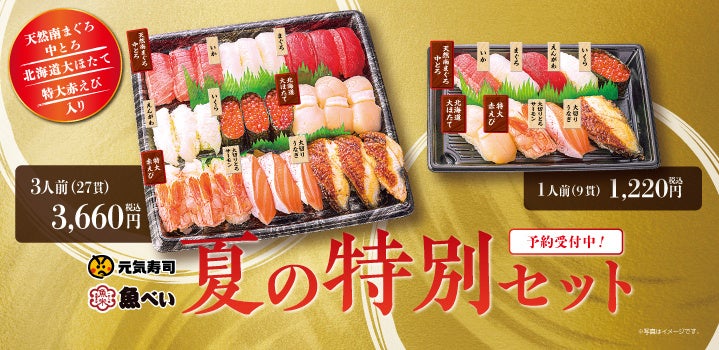 天然南まぐろ中とろ、北海道大ほたて、特大赤えび、大切りとろサーモン、大切りうなぎ、など贅沢9種が入った夏限定のセットを、1人前、3人前とご用意しました。是非、夏休みやお盆のタイミングにご活用ください!