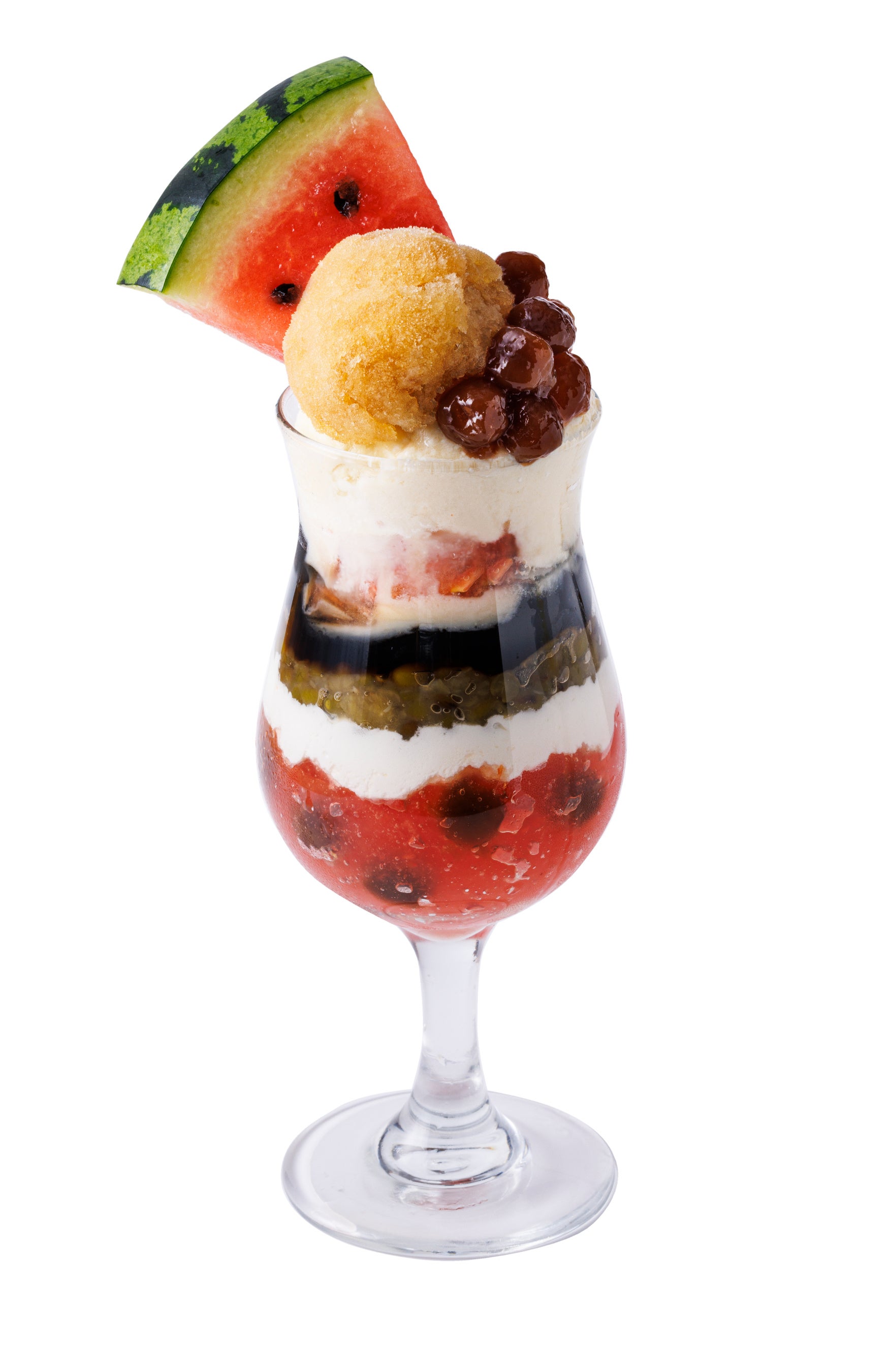 夏らしいスイカの豆花パフェは仙草ゼリー、緑豆の甘煮などを味わいのコントラストをお楽しみいただけます。季節限定の豆花パフェです。