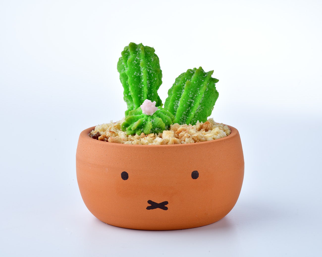 まるで本物のサボテンの鉢植えのようなビジュアルの、ポット入りカスタードプリンです。ミッフィーのお顔がデザインされた素焼きのポットには、濃厚なカスタードプリンとホイップクリームが入っています。プリンの上には、サボテン型のクッキーとグラノーラをトッピング。素焼きのポットはアフターユースできるため、食べ終わった後はお花を植えて育てたり、器としてもご利用いただけます。