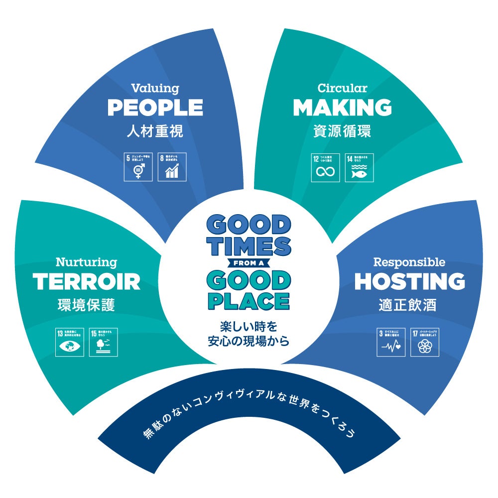 また、国連の持続可能な開発目標(SDGs)を支持する「サステナビリティ・企業の責任に関する2030年までのロードマップ―楽しい時を安心の現場から」に示すとおり、持続可能な発展を目指すと同時に、責任ある飲酒の普及に努めています。その精力的な取り組みが認められ、エコヴァディス社からゴールド評価を受けた、国連のグローバルコンパクトのリーダー企業でもあります。