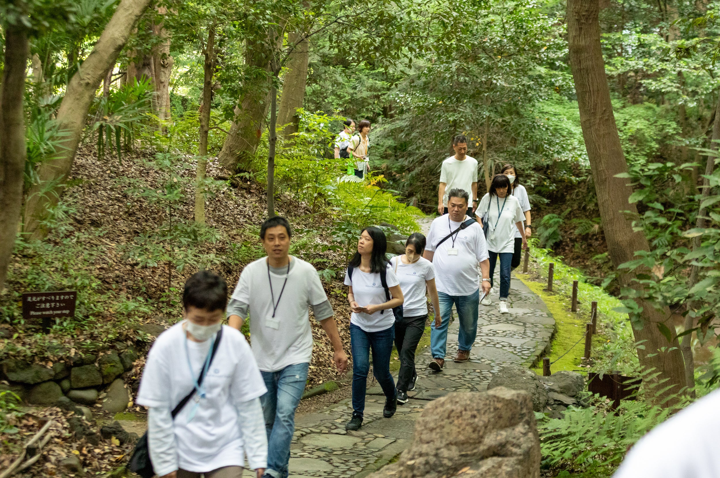 3つのエリアに分かれて、清掃活動をしながら、自然に触れるウォーキングツアーを実施。同行いただいた日本自然保護協会の担当者様から「ウェルビーイングと社会貢献について」のレクチャーを受け、自然の特徴や豆知識などを散策しながら学びました。