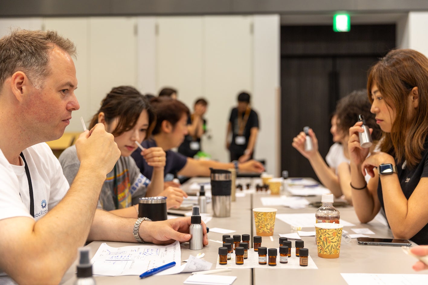 群馬県みなかみ町のアロマ工房から講師をお迎えし、アロマの効能とウェルビーイングにもたらす影響を学び、ハーブやフルーツ、木などの素材を蒸溜したオイルを使ってアロマブレンディングの体験を実施。