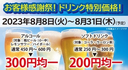 ・フェア内容:店内でお食事をしていただいた方限定、“ソフトドリンク、アルコールを特別価格”でご提供いたします。