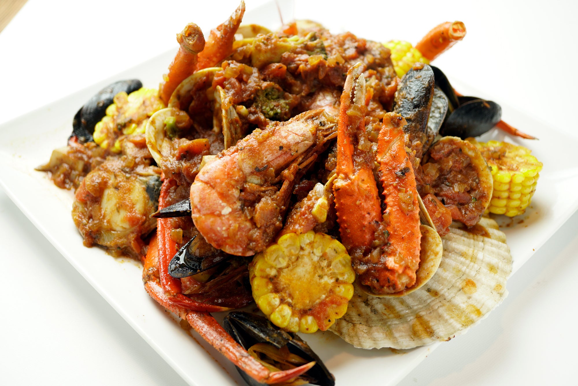 一度食べたらクセになるコースのメインのケイジャンシーフード。