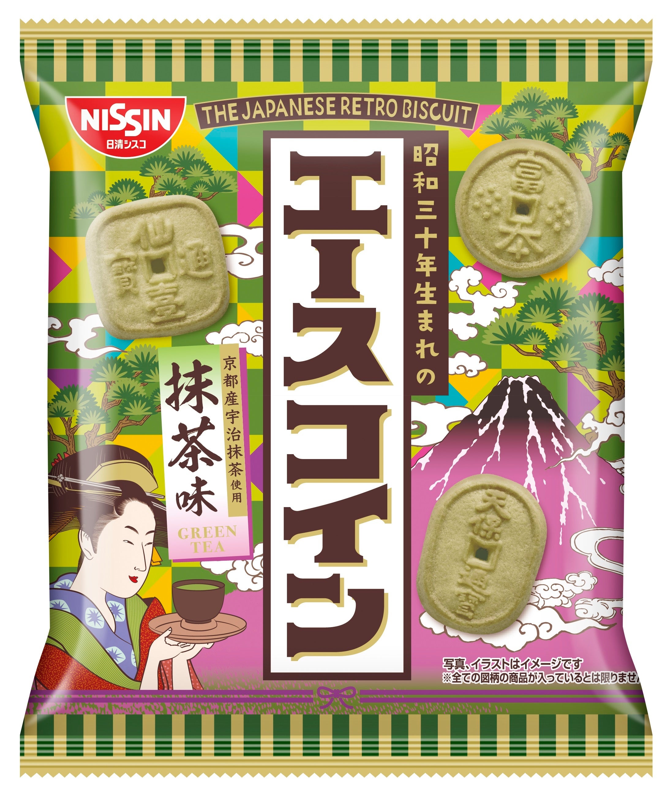 香り豊かな京都産の宇治抹茶を生地に加えて焼き上げたビスケットは、抹茶のうまみが後引くおいしさが特長です。パッケージは、日本の代表的な伝統文化として世界に知られている“浮世絵”をモチーフとして、カラフルなデザインに仕上げました。また、パッケージの裏面には、袋から取り出したビスケットのデザインで運勢を占って遊べる“エースコイン金運試し”をプリントしました。