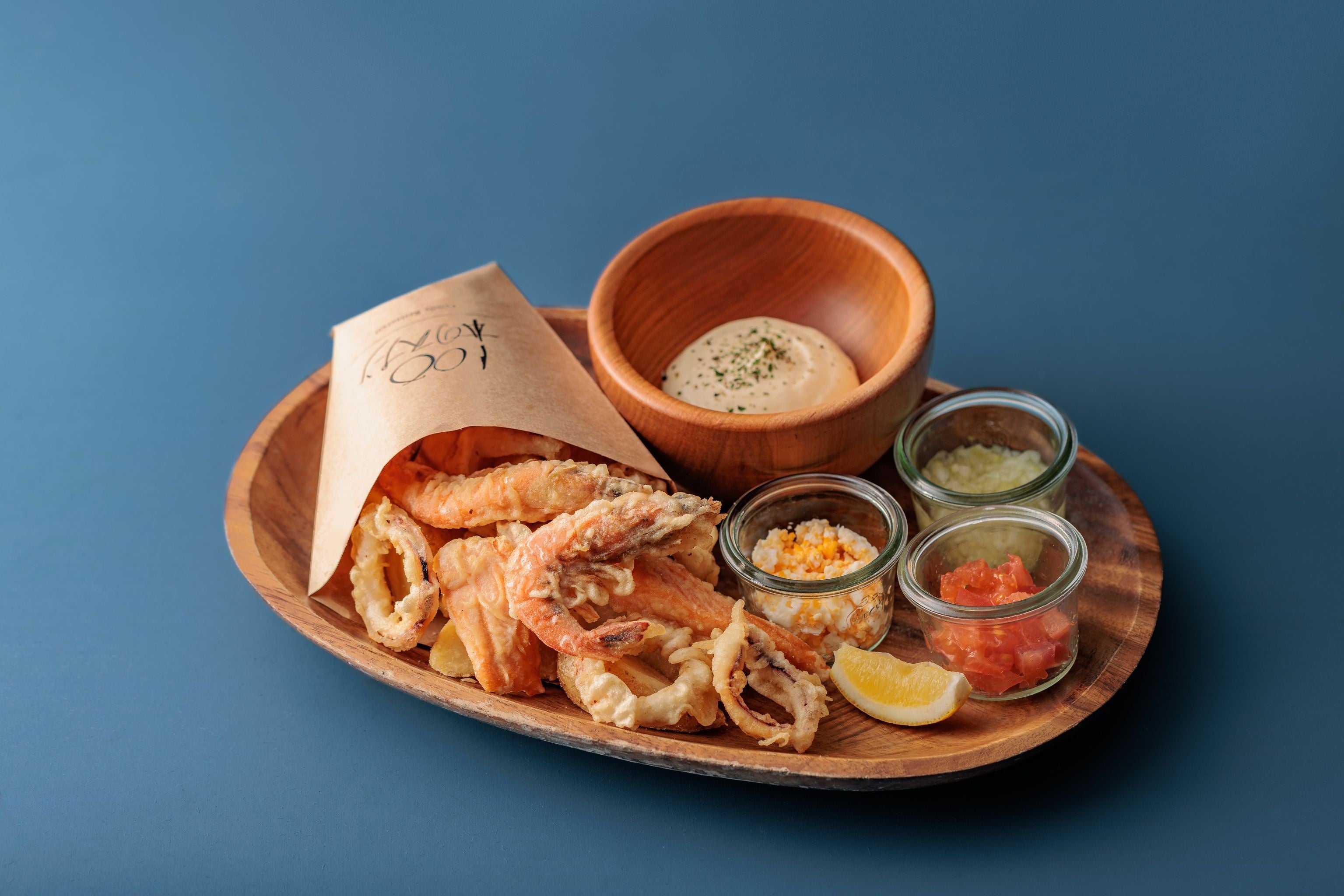 お好みの薬味を混ぜ合わせて自分だけのタルタルソースで魚介とポテトのフリットをお楽しみください。
