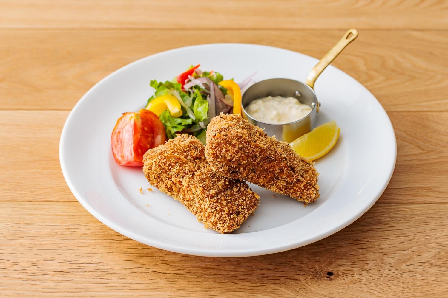 和歌山県すさみ町産のシイラを厚切りにカット。オリジナルスパイス粉と香草パン粉で衣付けし、外はサクサク、中はふっくらジューシーに仕上げました。自家製のタルタルソースをつけてお召し上がりください。