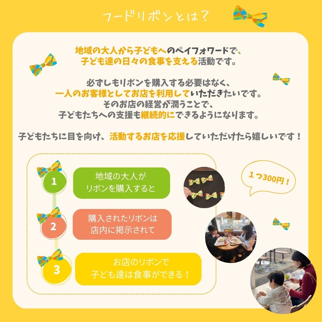 飲食店の利用客が一つ300円のリボンを購入し、お店に支援することで子ども達が無料で食事ができるようにする「フードリボン」の仕組みで、全ての子どもに食のセーフティネットを届けています。