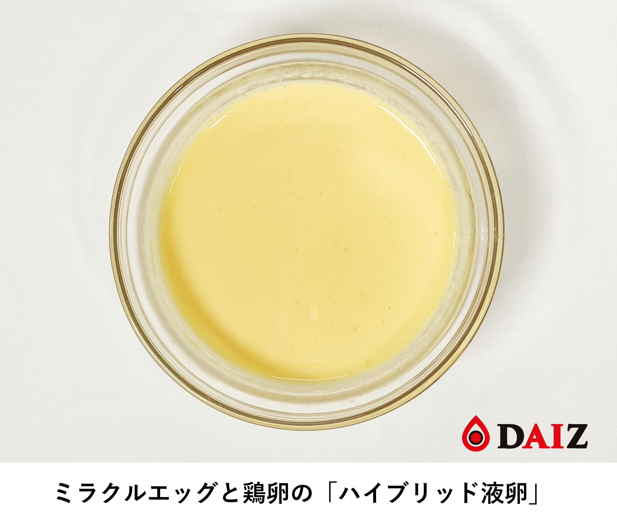 2023年、食品業界は深刻な鶏卵の供給不足と価格の高騰に直面し、外食・小売業界では卵使用メニューの休止・休売が相次ぎました。DAIZはかねてから植物肉「ミラクルミート」の開発・量産と並行して植物性卵の研究を進めてきましたが、この度、次世代植物性液卵「ミラクルエッグ」の素材開発、ならびにミラクルエッグと鶏卵を混ぜ合わせたハイブリッド液卵の開発に成功しました。