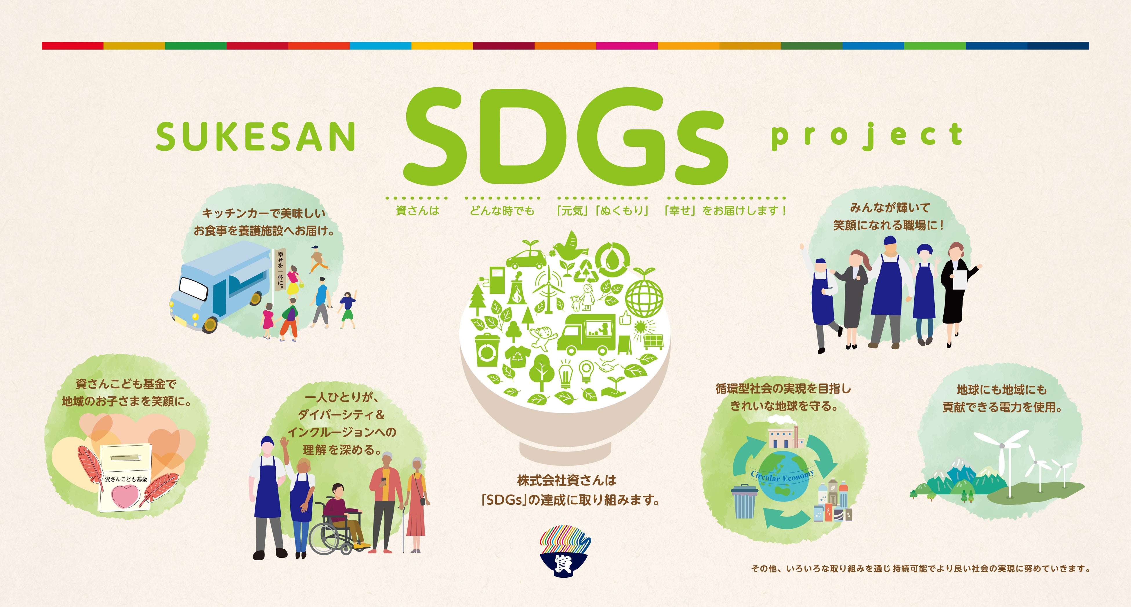 「資さんうどん」では、2021年3月に「資さんSDGs」宣言!を行い「”幸せ”な世界を創る」を目標として掲げ、一人ひとりが目標達成に向けて意識して行動し、より良い社会の実現に向け活動しています。ダイバーシティ&インクルージョンを重視した職場体制の構築や、サーキュラーエコノミー実現に向けた産学官が連携する事業への協力、実質CO2ゼロの自然エネルギーの利用等、活動内容は多岐に渡りますが、中でも「地域の宝」である、お子さまに向けた取り組みについては注力しています。「資さんこども基金」の設立や、「資さんの食育教室」の実施、「児童養護施設」や「こども食堂」へのキッチンカーでのご訪問・お食事のご提供等、精力的に活動を行っています。お子さまに向けた取り組みについて、現在は、福岡地区を中心に活動していますが、今後は「資さんうどん」出店地域への活動拡大も視野にいれて取り組んでいます。