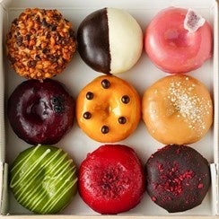 ROOTHドーナツはニューヨークで着想を得て開発した直径 5 cm のミニドーナツ。生地にヨーグルトを入れ、 甘さひかえめ。カラフルなソースコーティングは手作りでひとつひとつ仕上げています。 ※人工甘味料不使用。