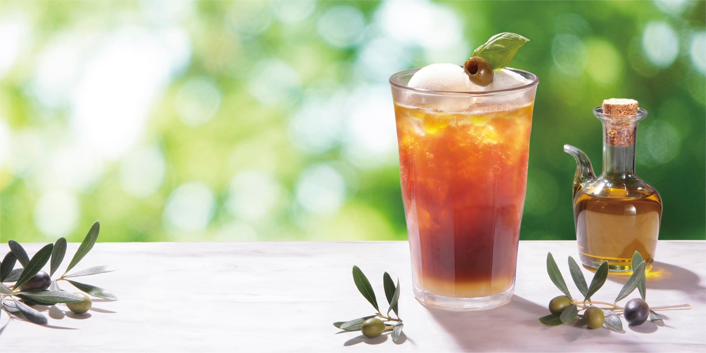 ダブルネルドリップ方式※で抽出したコーヒーを炭酸水で割って作った「コーヒースパークリング」に、シチリア産の華やかに香るオリーブとオリーブオイルを合わせた、夏にぴったりの爽やかなアレンジコーヒーです。ベースとなるダブルネルドリップコーヒーには、コロンビア産の浅炒り豆を採用しました。パパイヤや洋ナシのような明るい酸味を感じられるコーヒーの味わいが、オリーブオイルの華やかな香りをさらに引き立てます。また、サトウキビのシロップを使用し、やさしい甘みが感じられるよう味覚設計しています。さらに、シチリア産の自然な甘みのあるオリーブと、バニラアイスをトッピングしました。暑い夏にぴったりのコーヒースパークリングをお楽しみください。