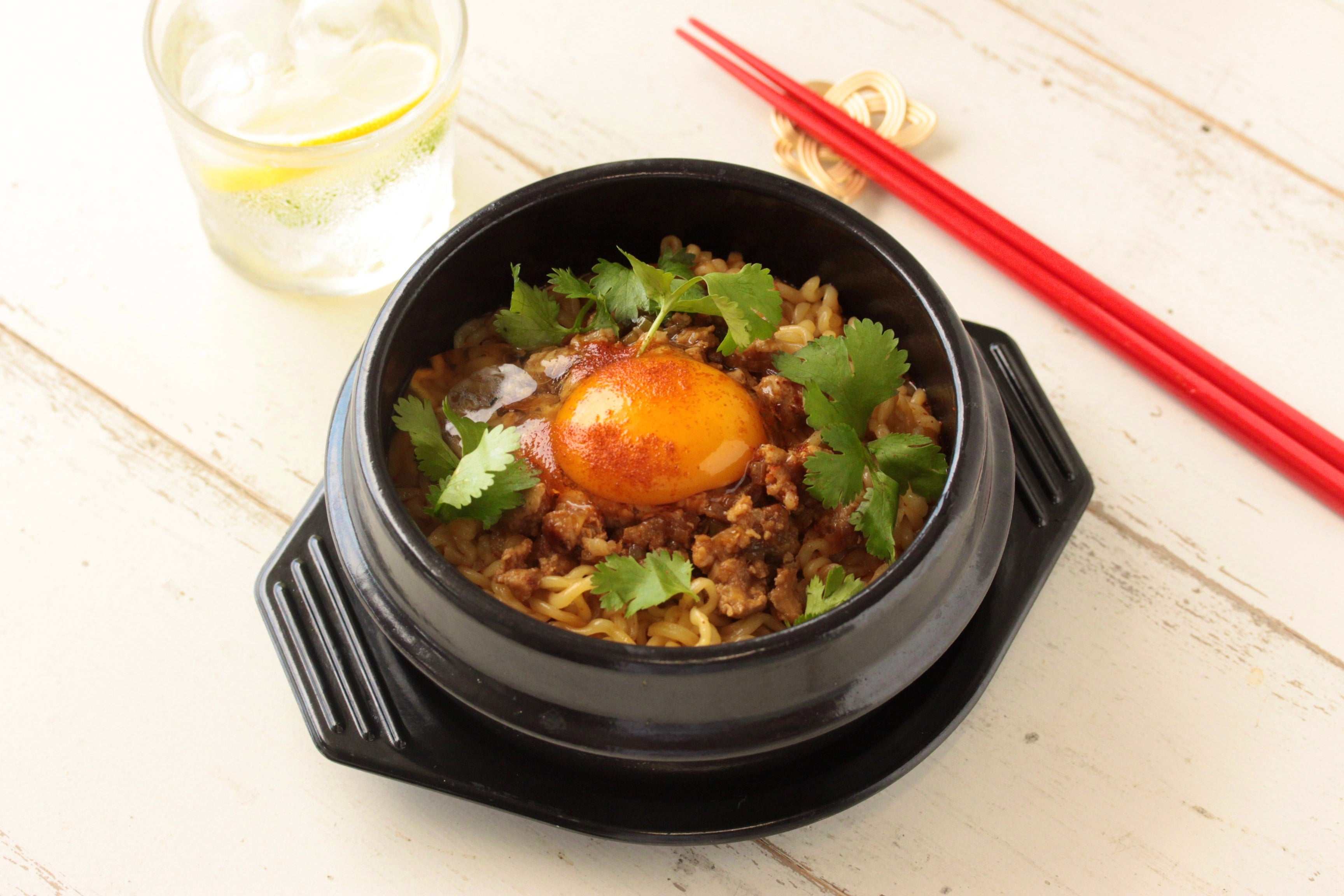 ② ①にパクチーを飾り、卵を割り入れてチリペッパーをかけた後、全体をよく混ぜてできあがり。
