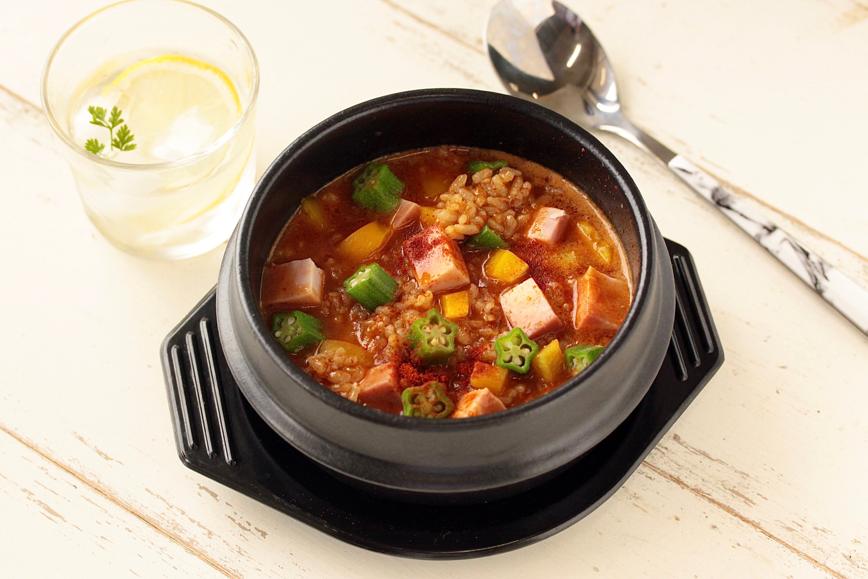 切ったオクラとごはんを加え混ぜ、ひと煮立ちさせたらできあがり。